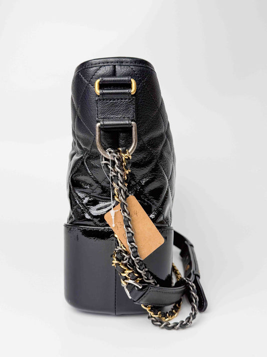 (A125) Chanel Black Patent Goatskin Medium Size Gabrielle Crossbody Bag, Ruthenium/Silver/Gold Hardware