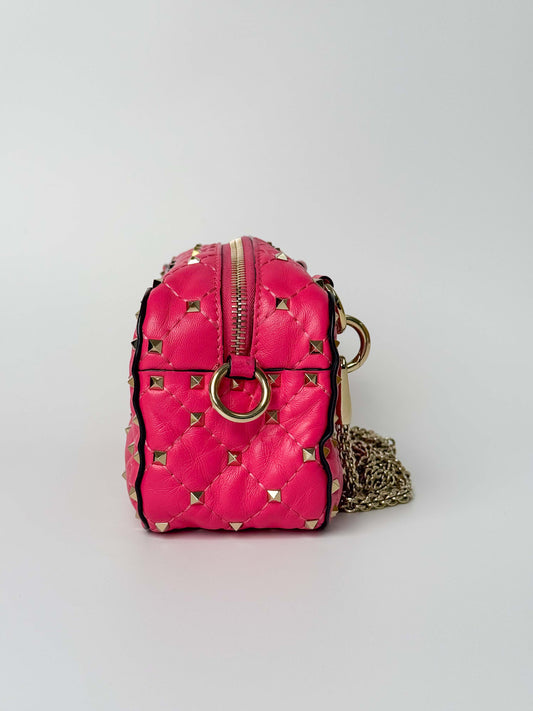 (A123) Valentino Pink Nappa Rockstud Spike Camera Bag, Champagne Gold Hardware