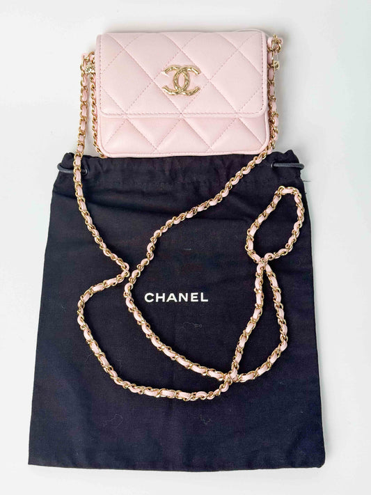 (A122) Chanel Light Pink Calf Leather Wallet with Chain, Champagne Gold Hardware
