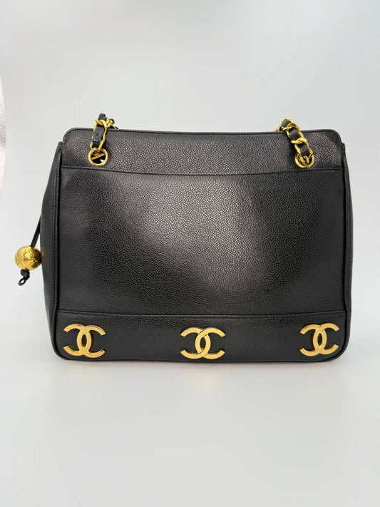 (AJ32) Chanel Black Caviar Triple CC Tote, 24K Gold-Plated Hardware