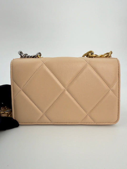 (AJ35) Chanel Beige Lambskin 19 Wallet on Chain, Gold & Silver Hardware