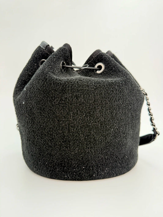 (AJ37) Chanel Black Canvas Deauville Drawstring Bucket Bag, Silver Hardware