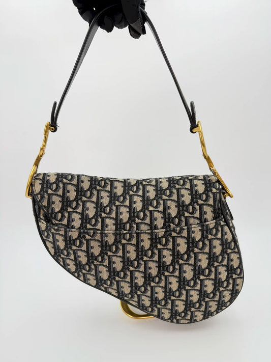 (AJ29) Dior Navy Oblique Medium Saddle Bag, Antique Gold Hardware