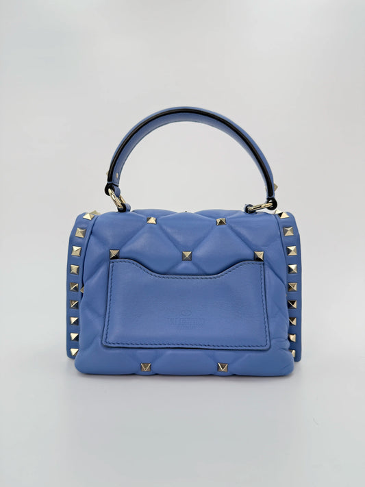(AJ34) Valentino Blue Quilted Calf Leather Mini Candystud Top Handle Crossbody Bag, Silver Hardware