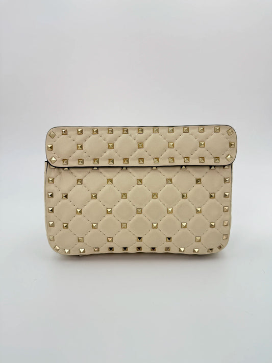 (AJ38) Valentino Spike Ivory Shoulder Bag, Champagne Gold Hardware