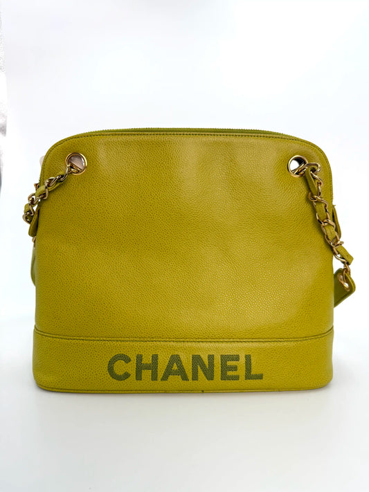 (AJ1) Chanel Vintage Logo Shoulder Bag, Lime Green Caviar, 24K Gold Plated Hardware