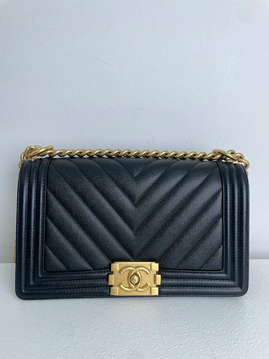 (A33) Chanel Black Caviar Chevron Medium LeBoy Antique Gold Hardware