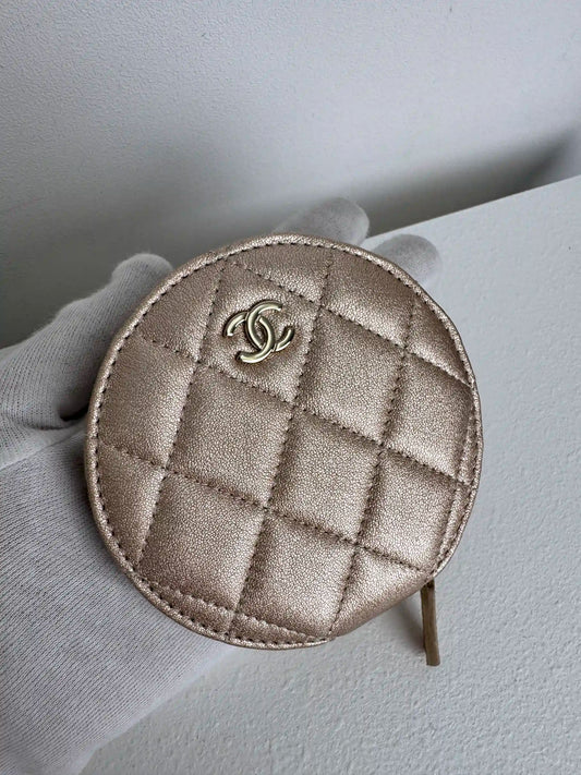 (A45) Chanel Champagne Gold Round Pouch & AirPods Holder Bag Charm Lambskin Champagne Gold Hardware
