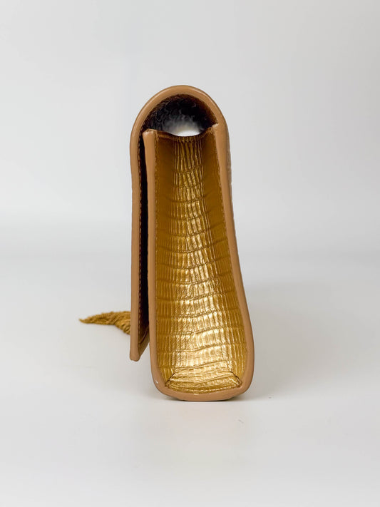 (A119) YSL Gold Embossed Leather Kate Tassel Clutch, Gold Hardware