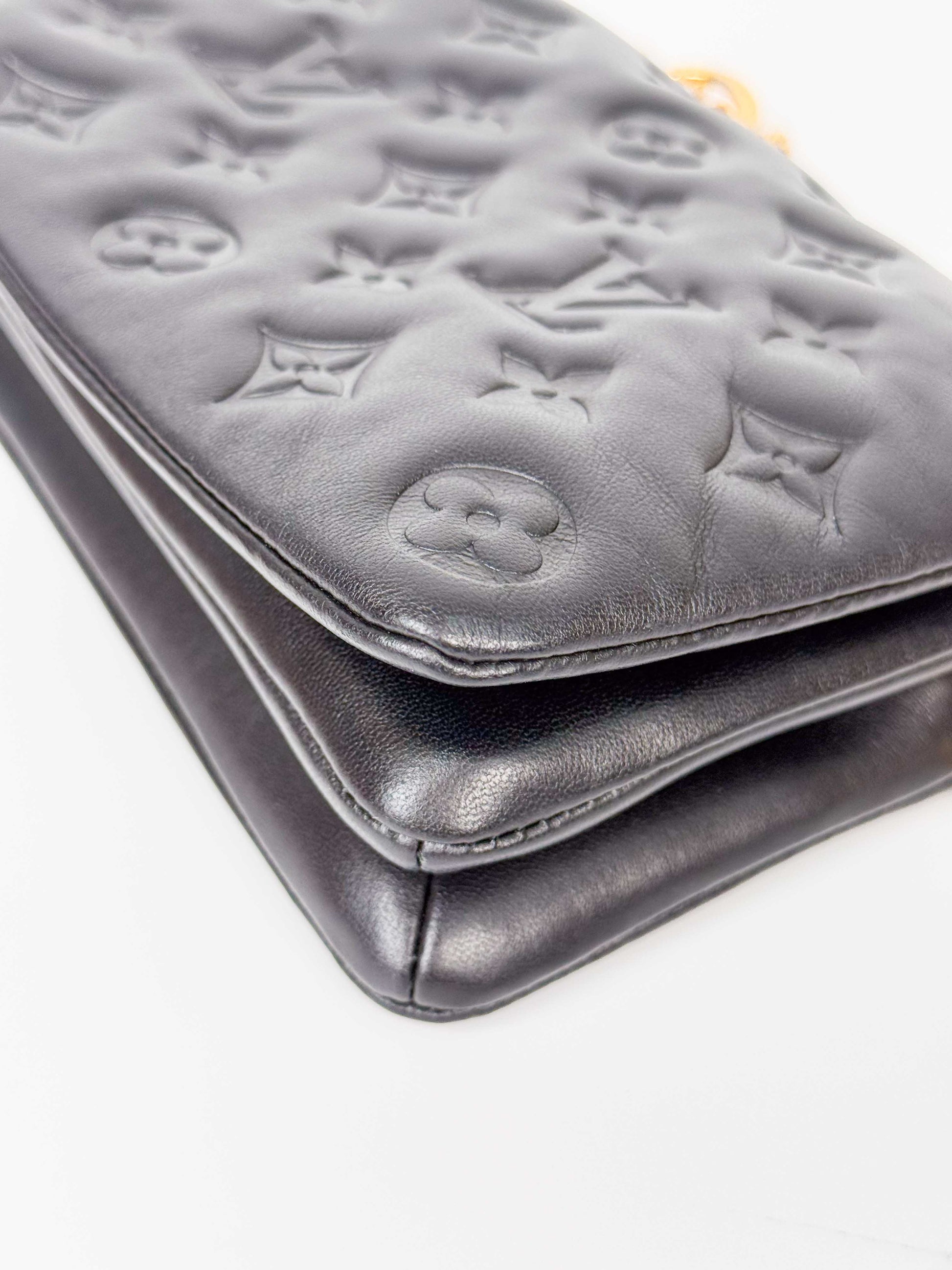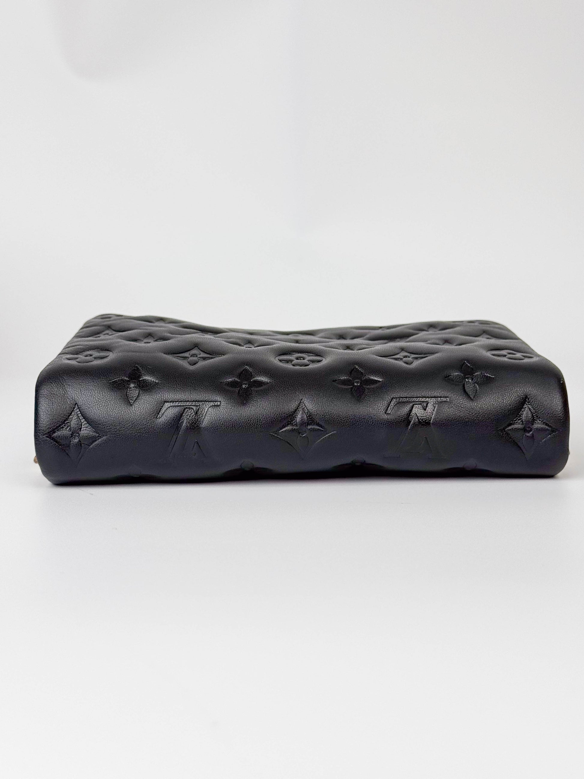 The Louis Vuitton Coussin Chain Pochette brings modern elegance with its sleek silhouette and luxurious details. Crafted in premium leather, it features gold-tone hardware and a versatile design that transitions effortlessly from day to night. The removable strap offers both crossbody and shoulder styling options, while the signature chain adds a chic statement touch. Comes with Entrupy authentication for guaranteed authenticity.