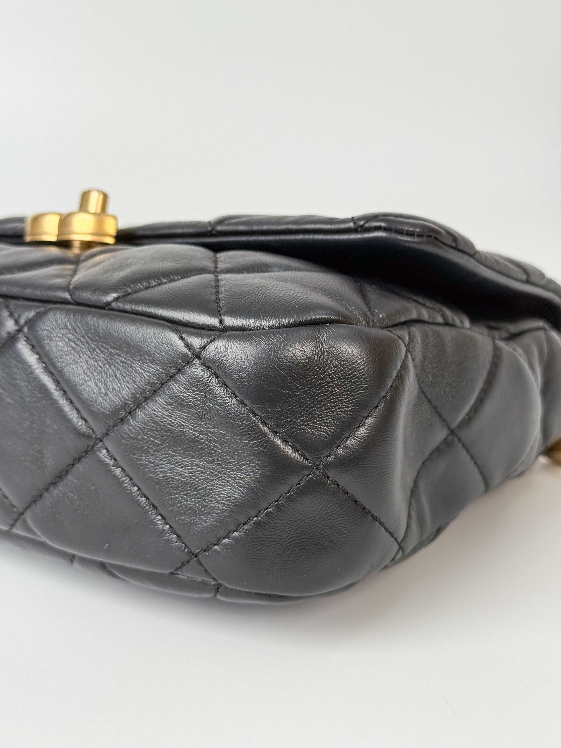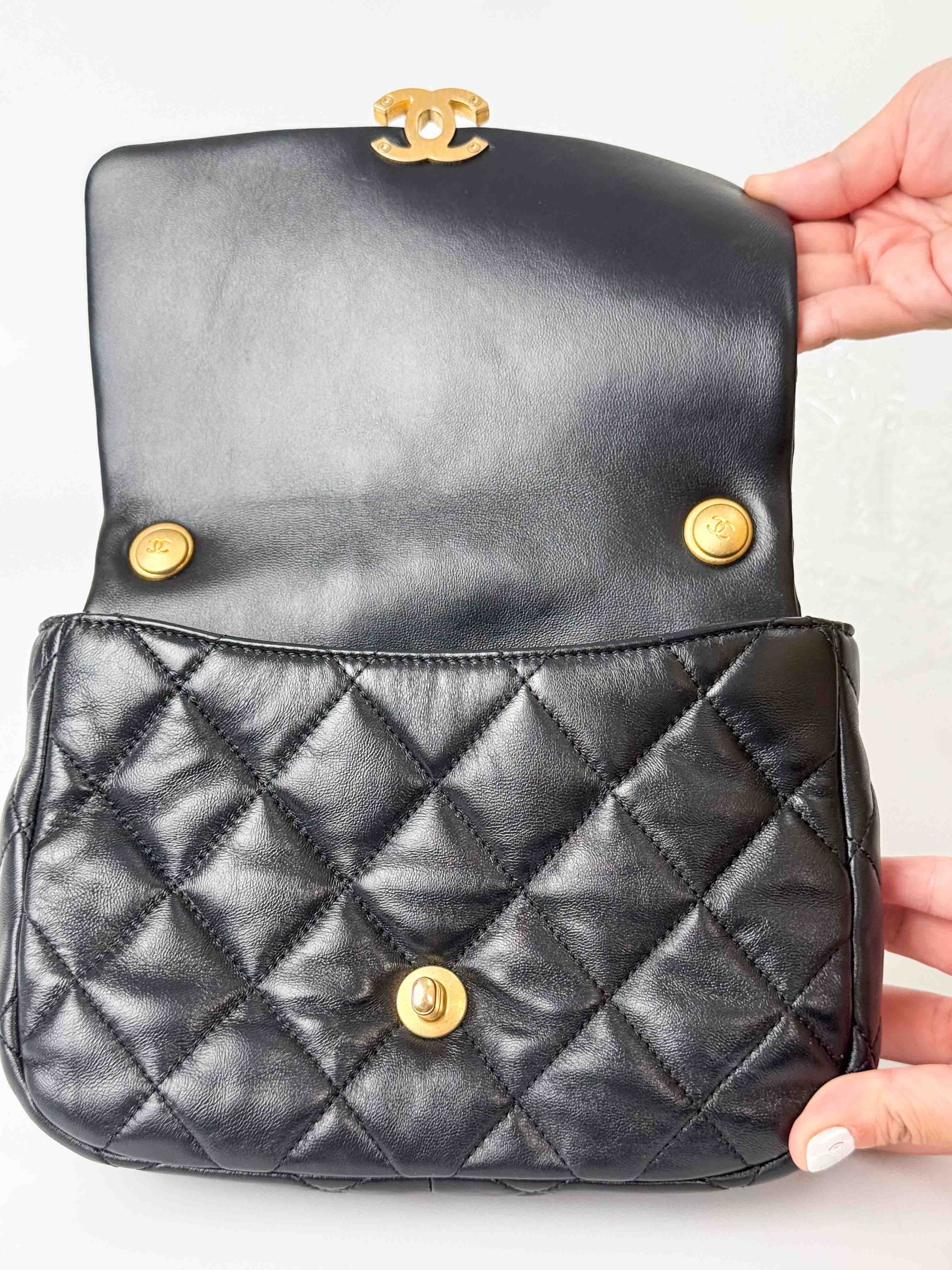 Crafted from smooth black lambskin, this Chanel flap crossbody features a chic mix of silver and black hardware for a unique edge. The microchipped design ensures authenticity and security, while its compact size makes it perfect for everyday elegance.