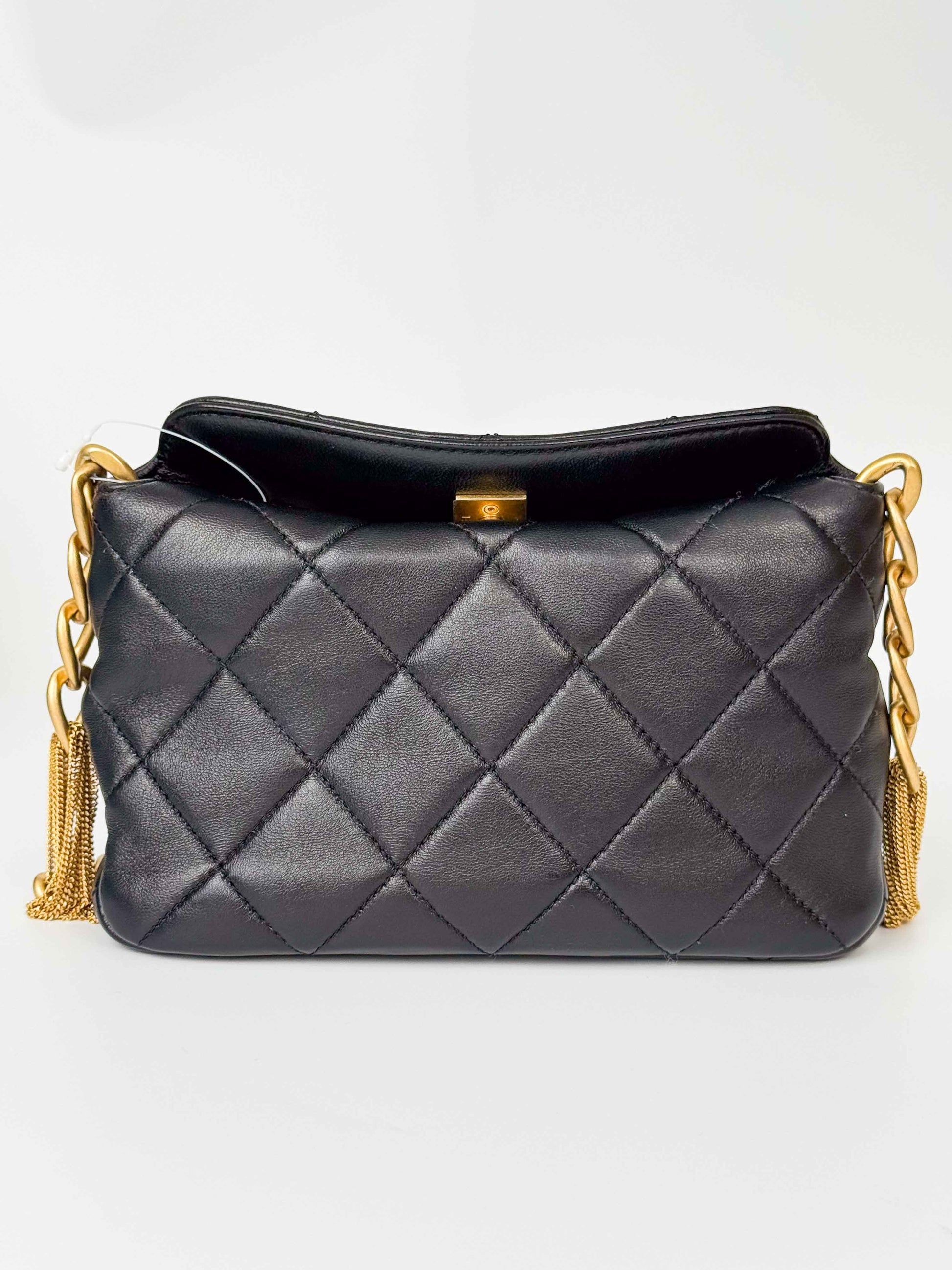 A chic and versatile Chanel hobo bag in smooth black calfskin leather, enhanced with antique gold hardware for a timeless yet contemporary look. The compact size makes it perfect for everyday essentials, while the microchip authentication ensures its authenticity.