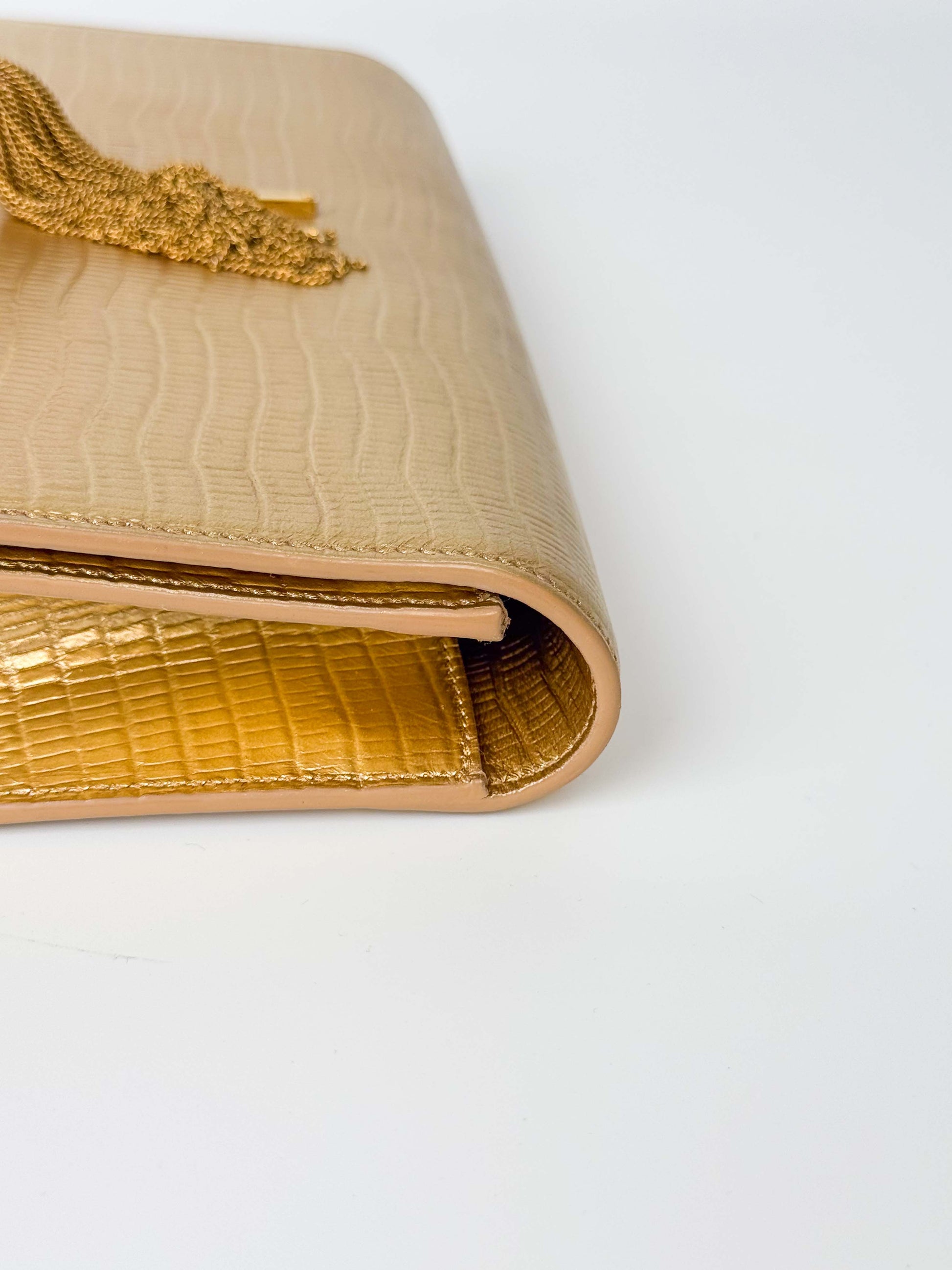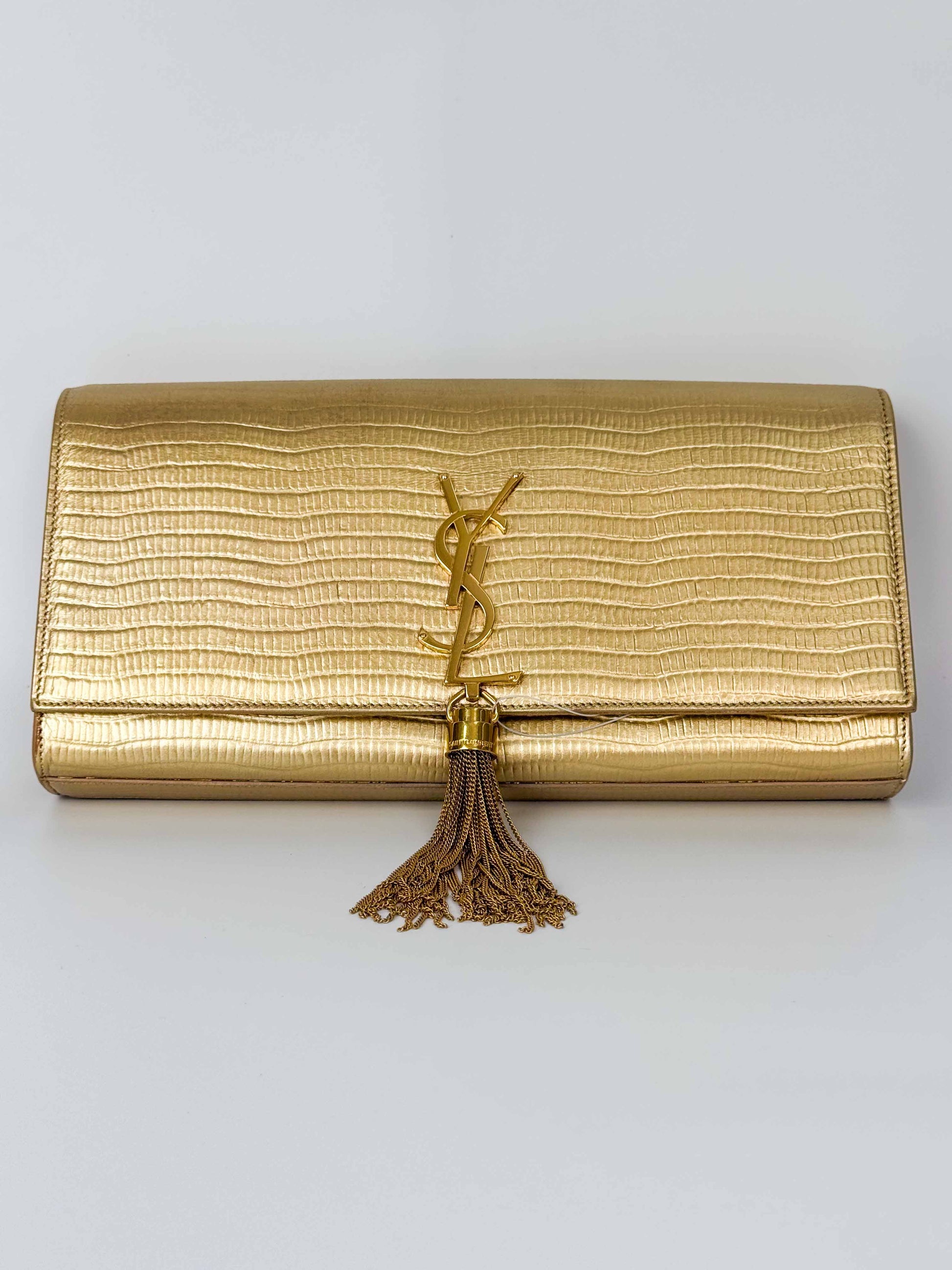 A glamorous YSL Kate Tassel clutch crafted from luxurious gold embossed leather, paired with iconic gold hardware. This elegant evening piece is perfect for formal occasions and adds a touch of sophistication to any outfit.