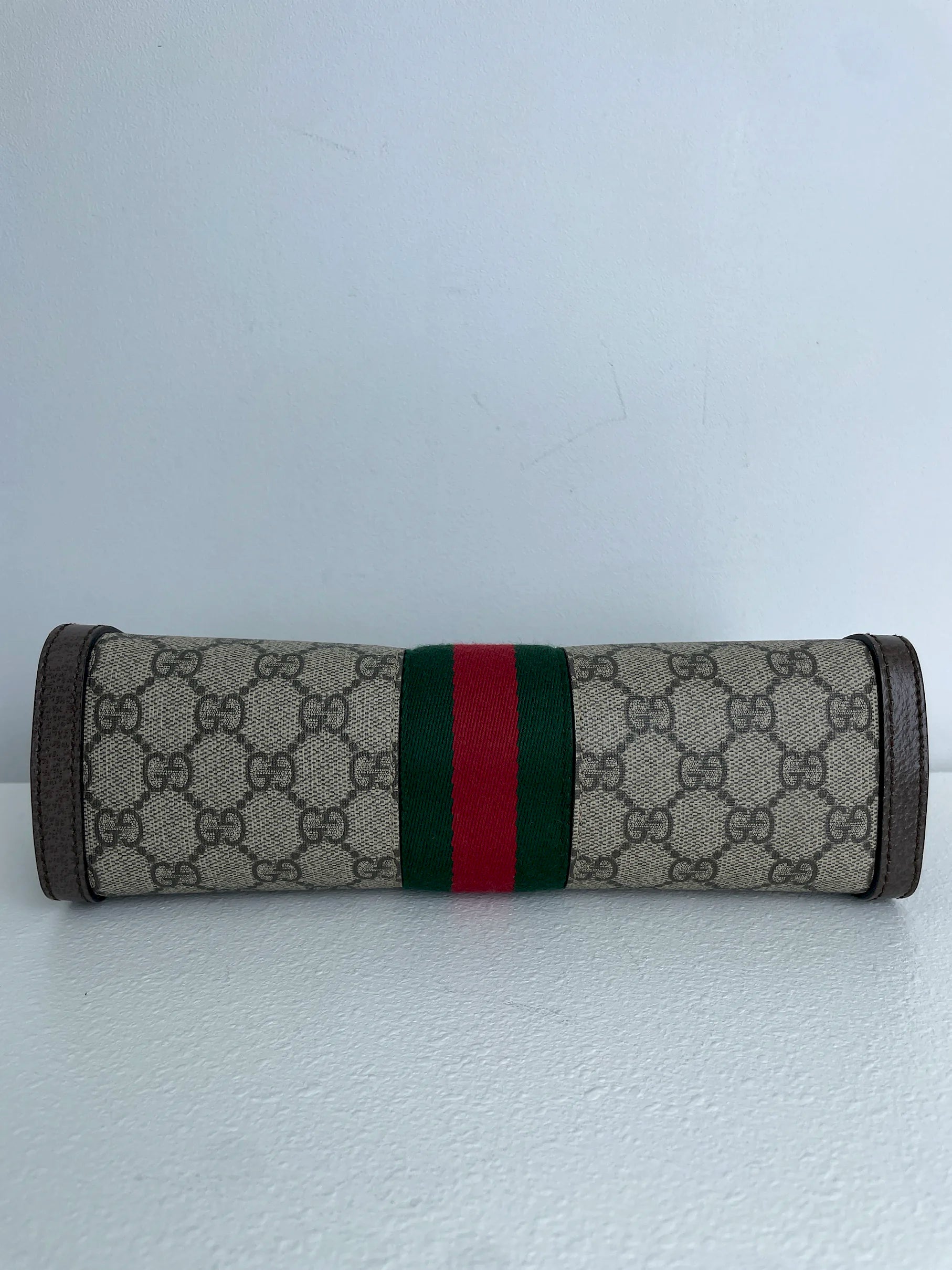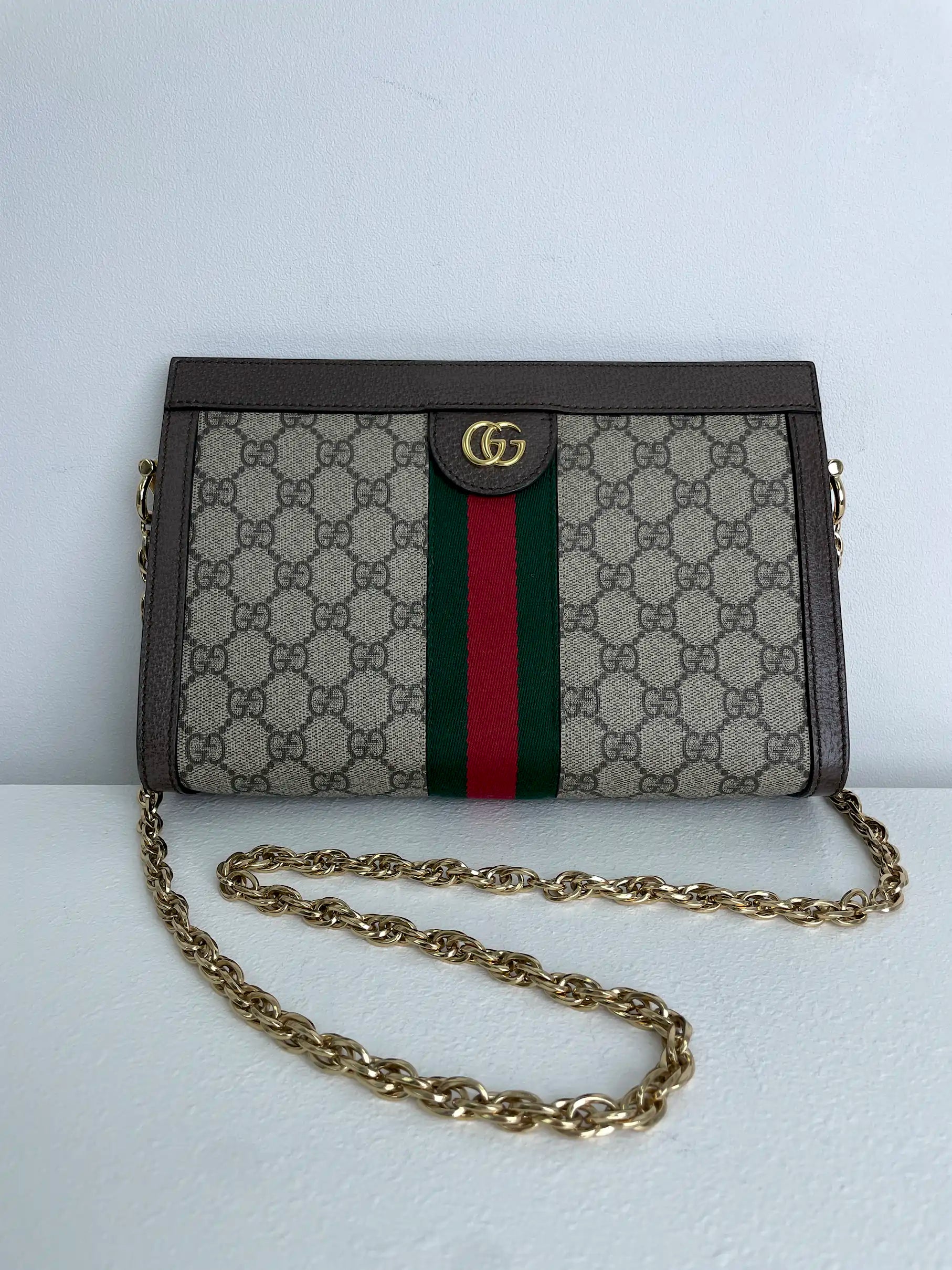The Gucci Ophidia GG Cherryline Bag blends vintage charm with playful elegance. Crafted from the signature GG Supreme canvas, it features a delightful cherry motif adorned with sparkling crystals. Gold-tone hardware accents add a luxurious touch, while the structured shape and compact size make it a versatile choice for day or evening wear.