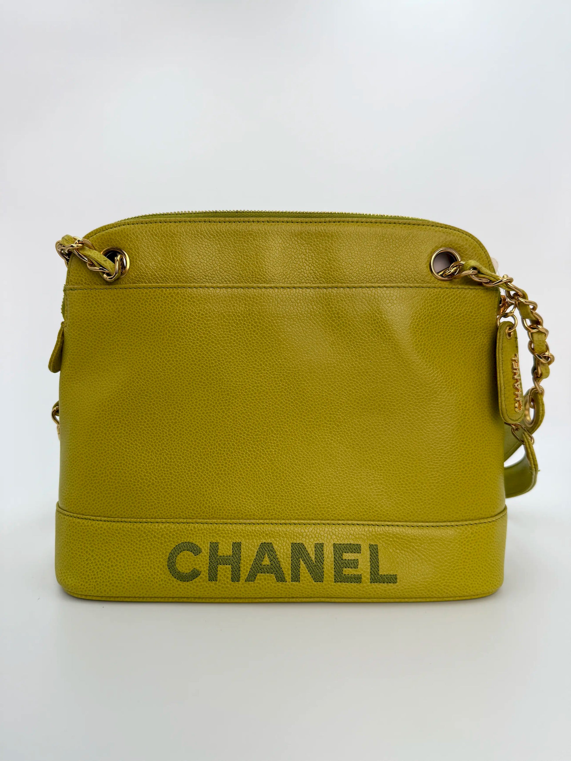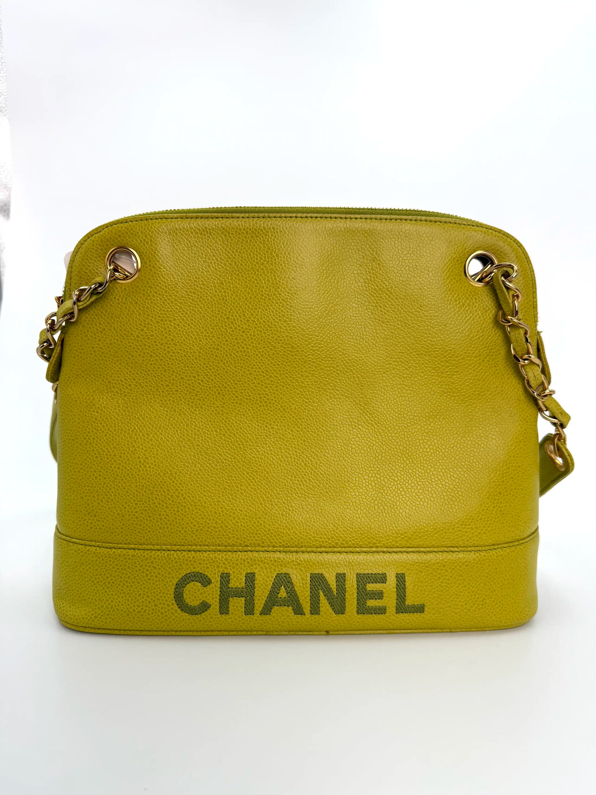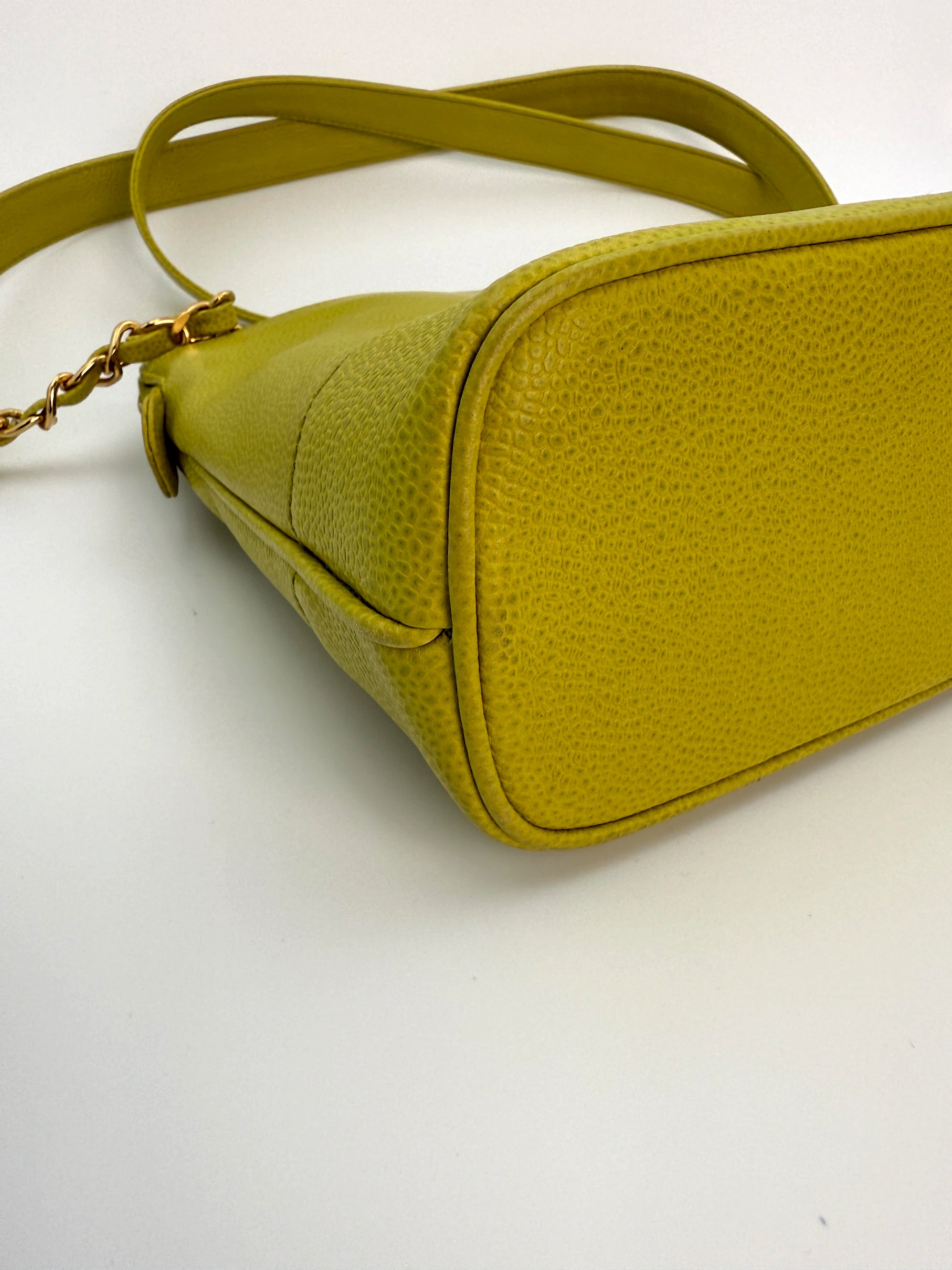 A rare vintage Chanel shoulder bag crafted from lime green caviar leather, featuring the iconic CC logo and luxurious 24K gold plated hardware. This structured and timeless piece from the mid-1990s embodies classic Chanel elegance, making it a collectible item for any wardrobe.
