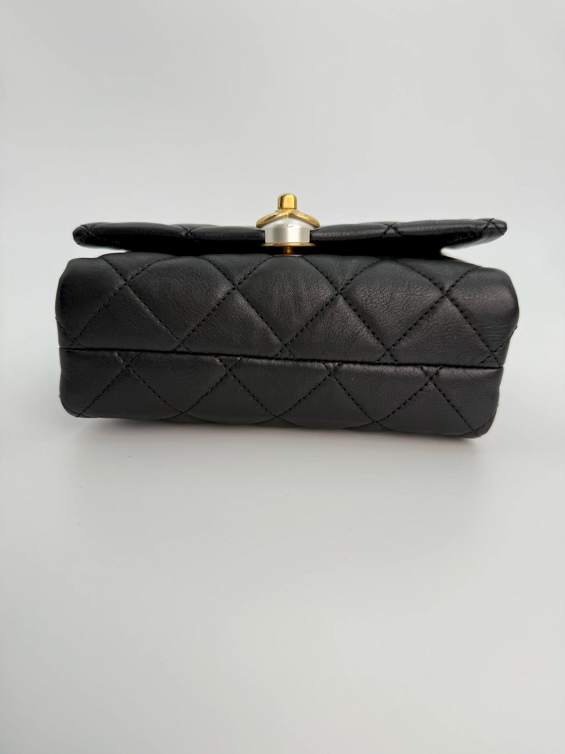 This Chanel Pearl Accordion Small Flap Bag is crafted from quilted calf leather in classic black, beautifully accented with gold hardware. The unique pearl-embellished detail adds a touch of sophistication, while its compact size and versatile design make it perfect for both day and evening wear.