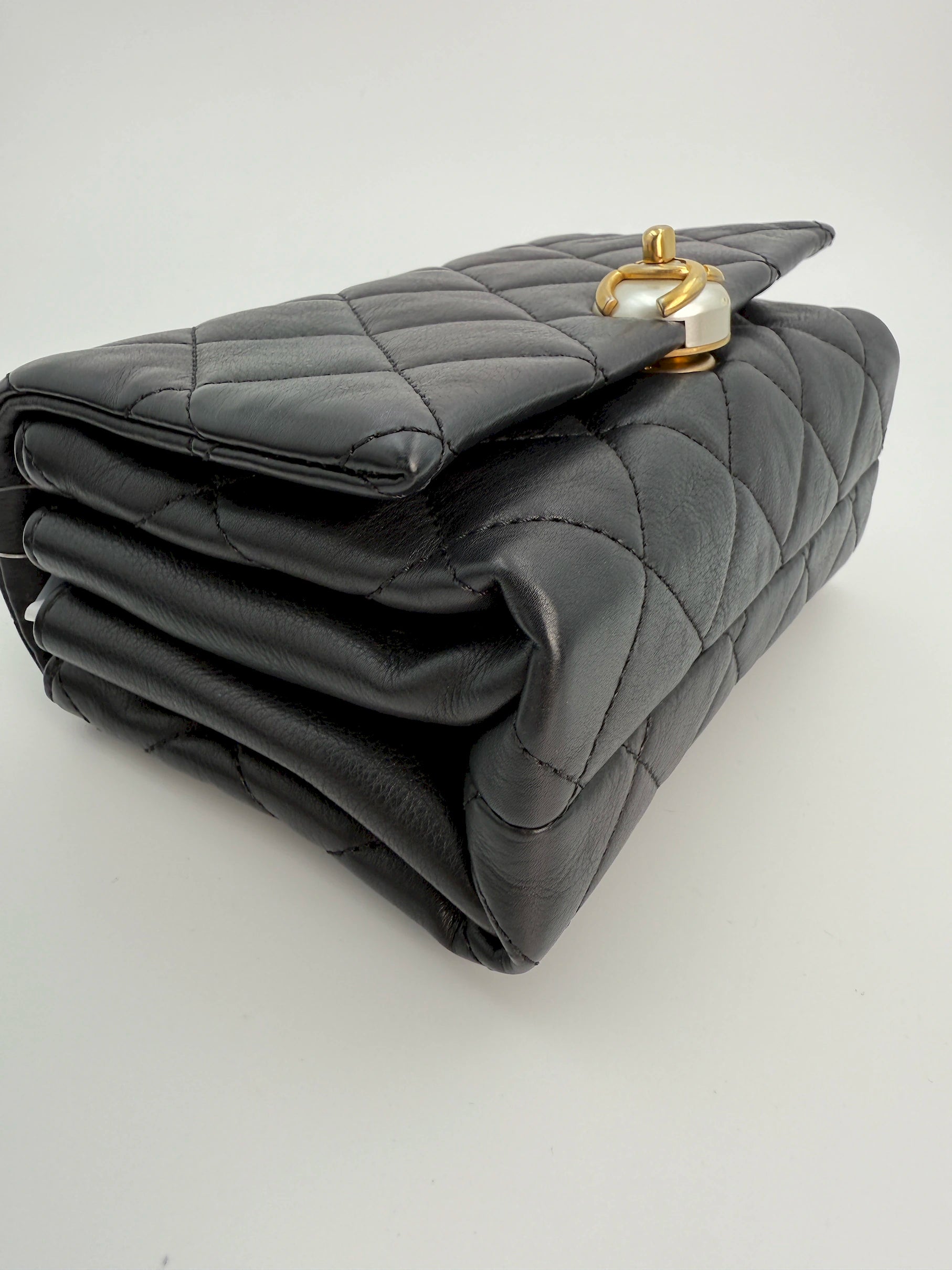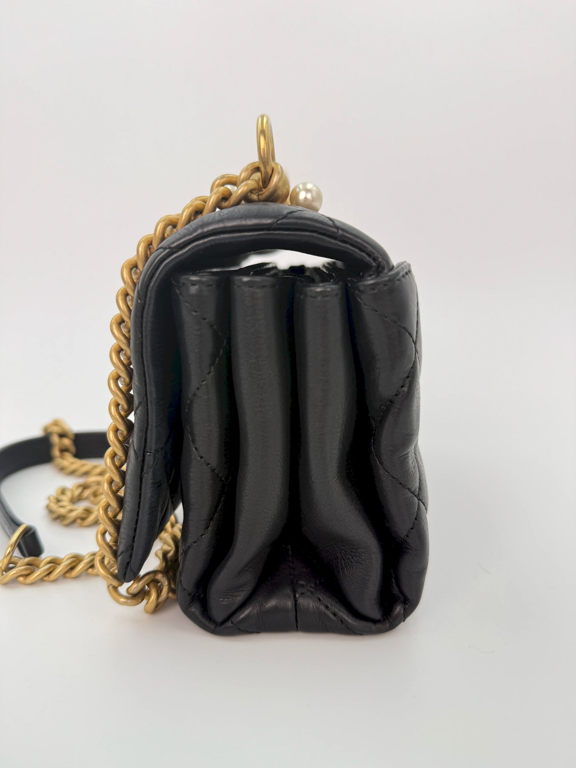 (AJ13) Chanel Black Quilted Calf Leather Pearl Accordion Small Flap Bag, Gold Hardware