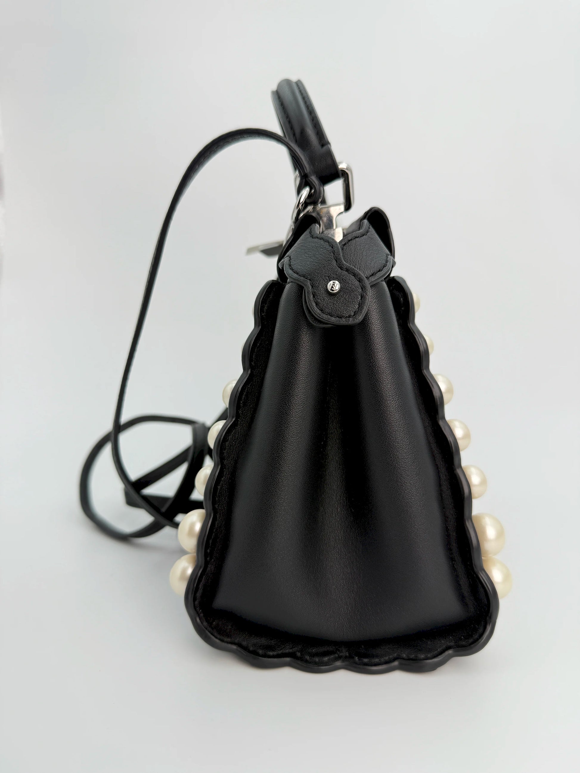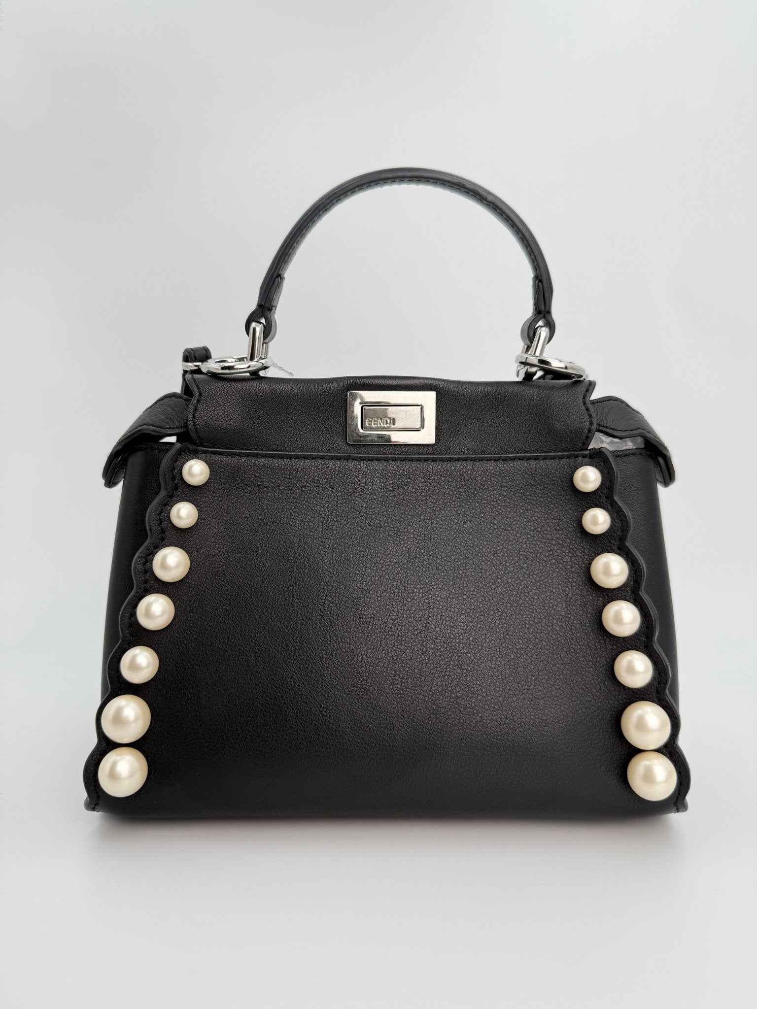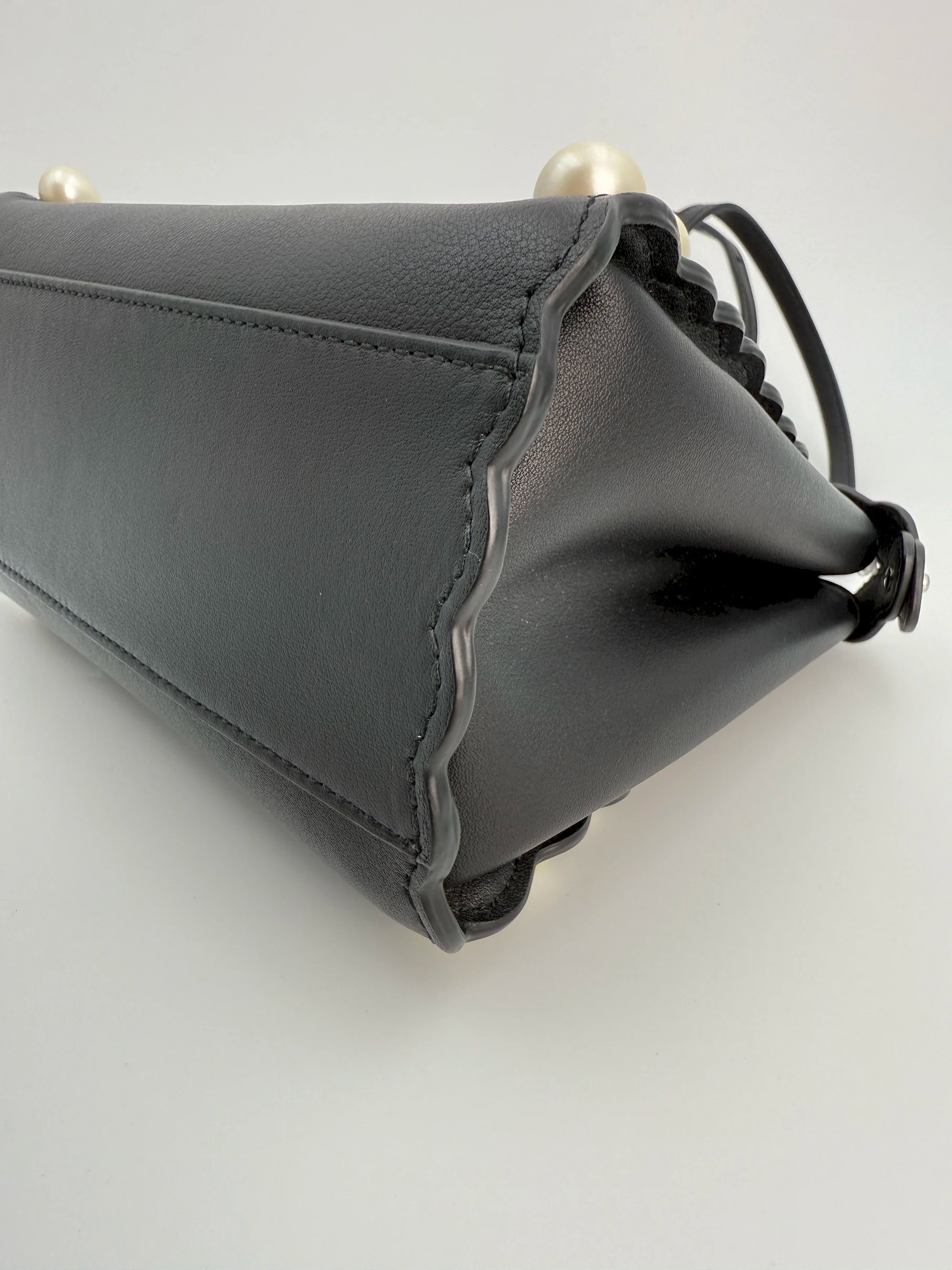 (AJ17) Fendi Black Calf Leather Pearl Embellished Small Peekaboo, Silver Hardware