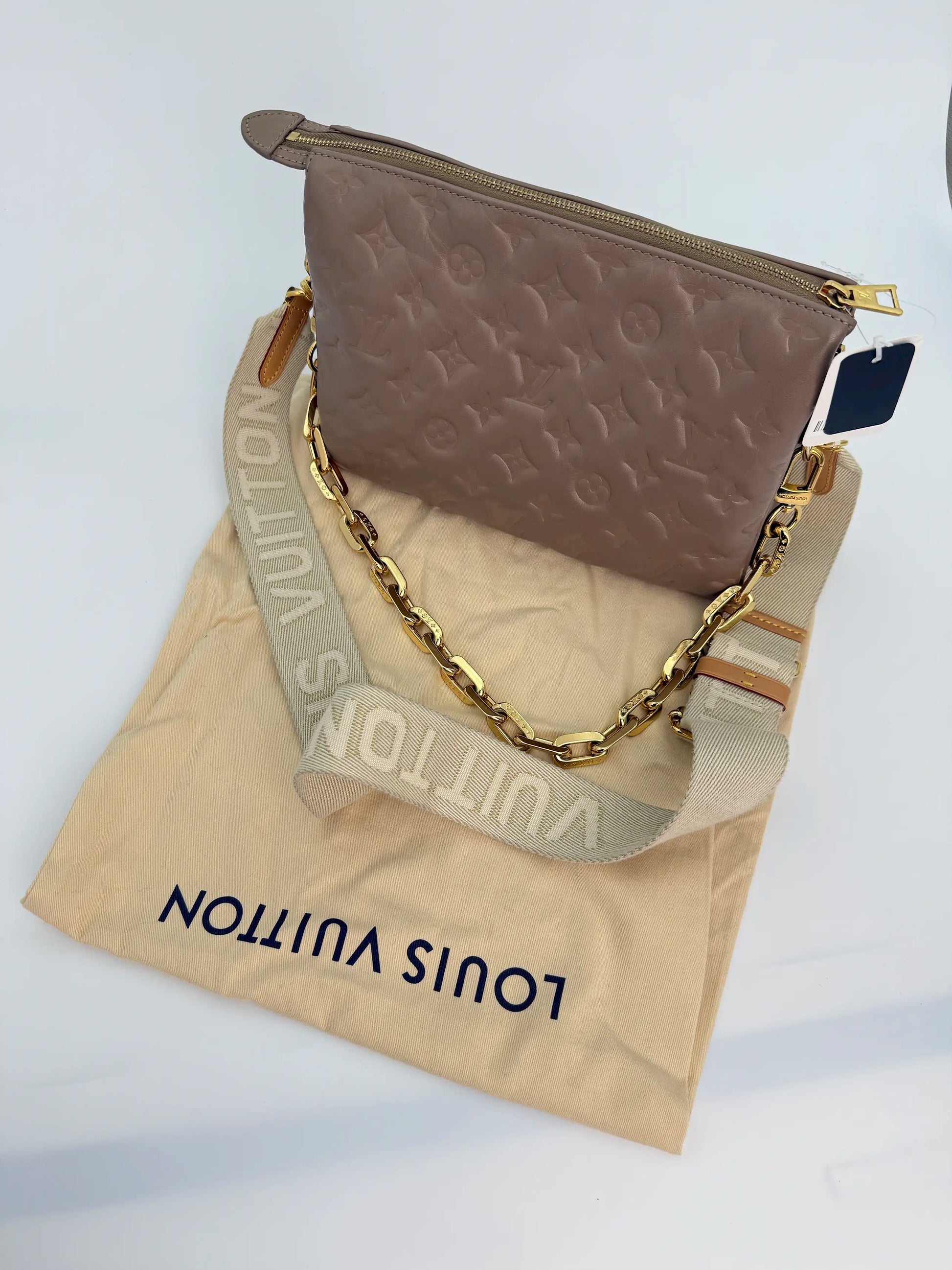 This Louis Vuitton Coussin PM is crafted in embossed beige monogram leather and features both a chic chain strap and a practical long shoulder strap. Designed to be carried as a shoulder or crossbody, it balances functionality with modern elegance. A versatile piece that transitions seamlessly from day to night.