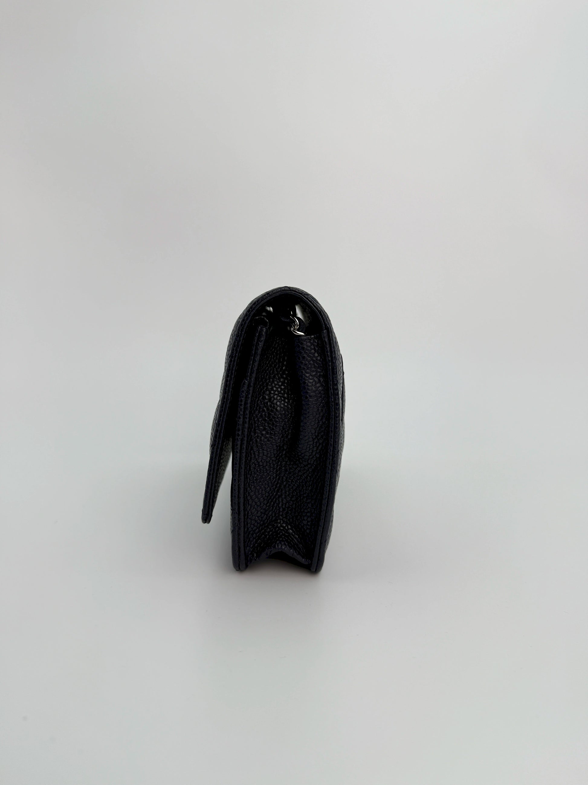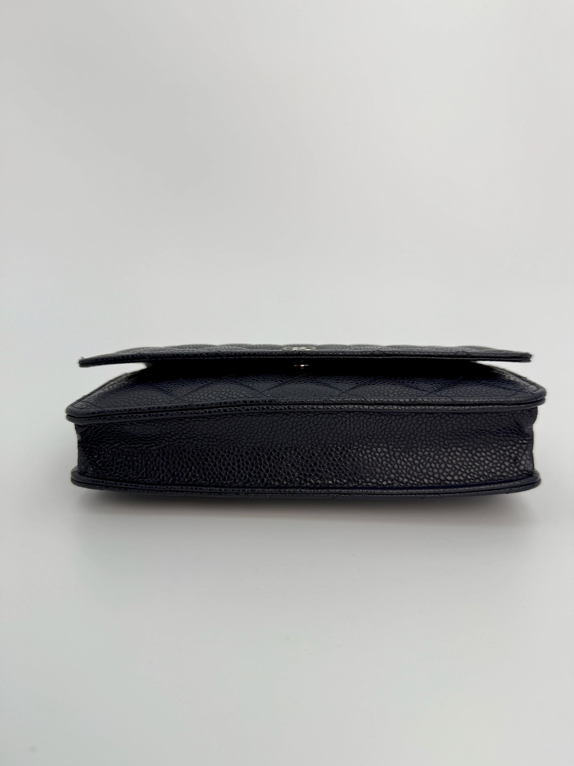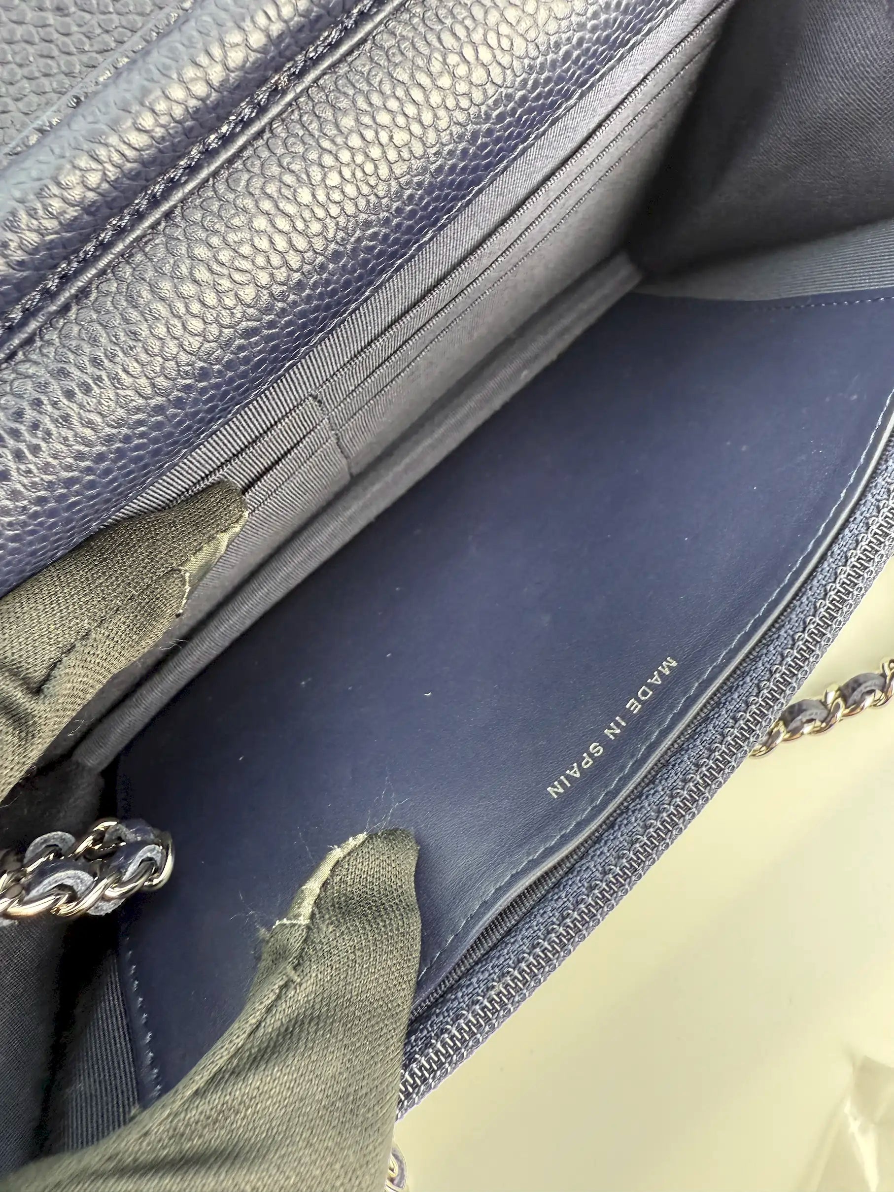 This Chanel Wallet on Chain (WOC) in navy black caviar leather combines timeless elegance with everyday practicality. Accented with silver hardware, it is designed to be worn crossbody or on the shoulder, making it an iconic piece for any collection. Compact yet functional, it offers just the right amount of space for essentials.