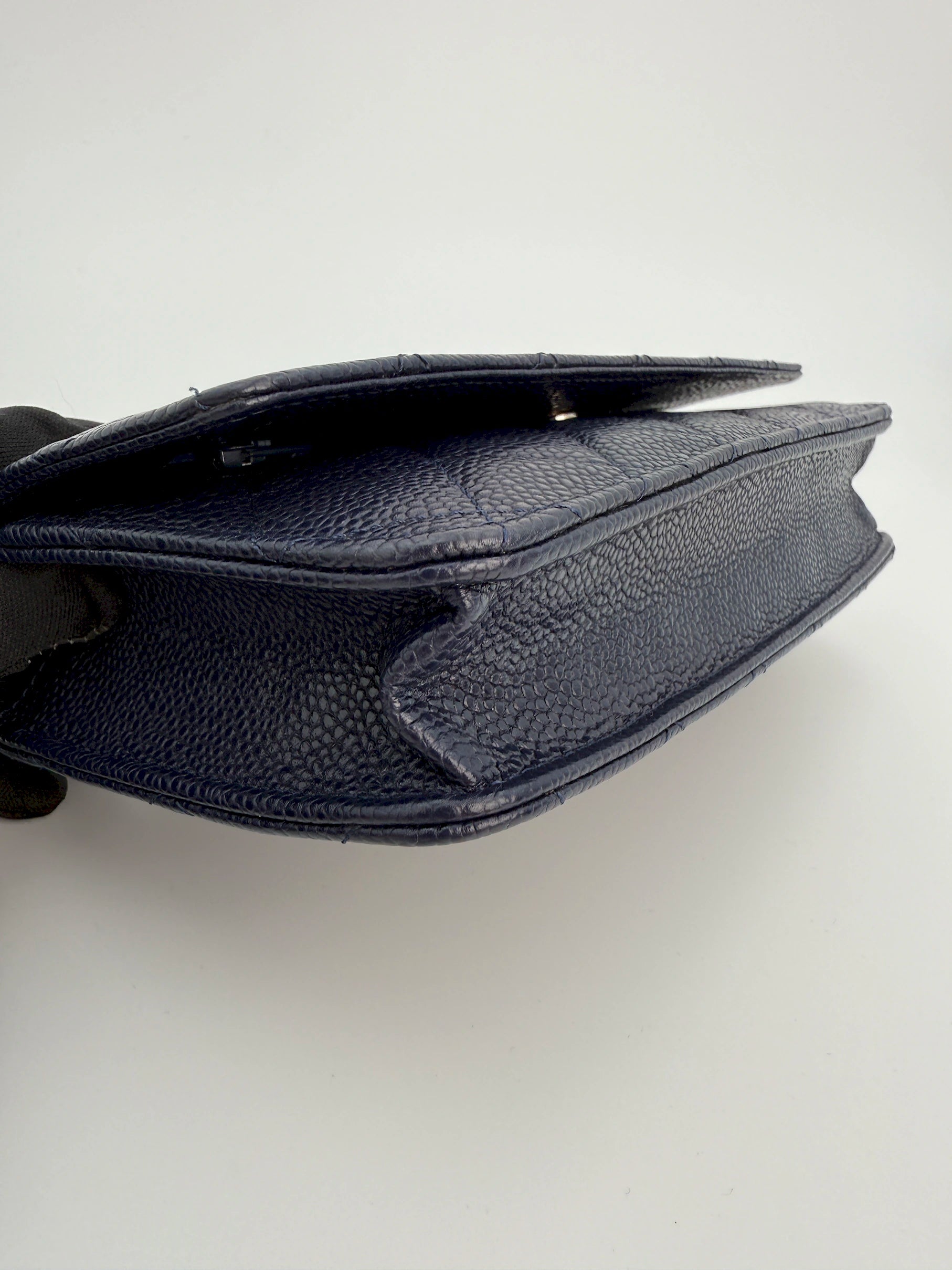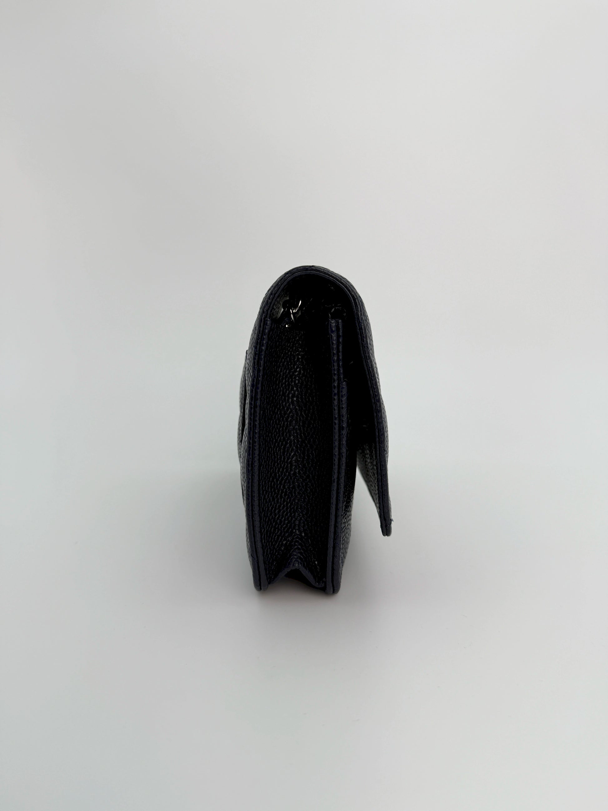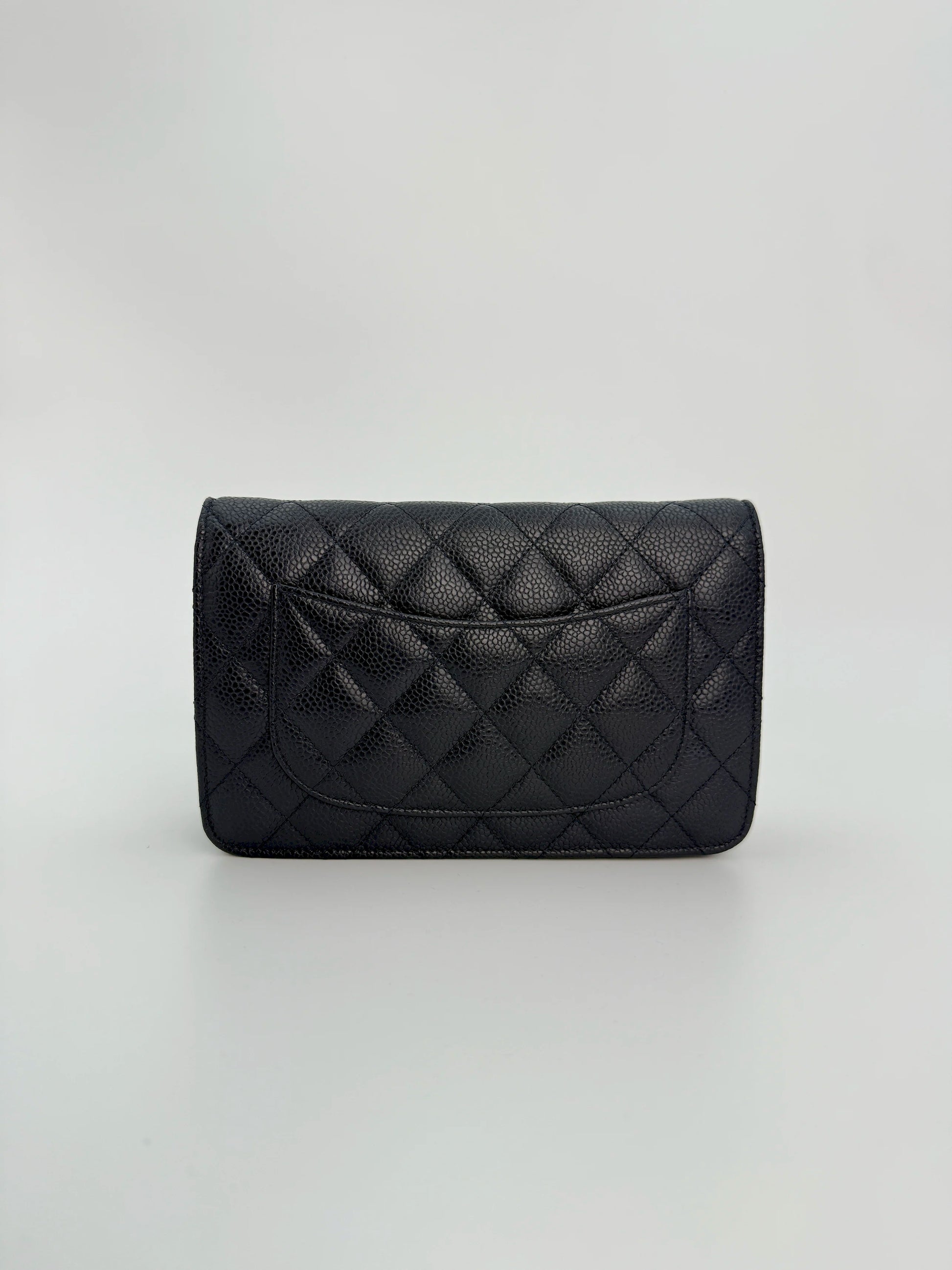 This Chanel Wallet on Chain (WOC) in navy black caviar leather combines timeless elegance with everyday practicality. Accented with silver hardware, it is designed to be worn crossbody or on the shoulder, making it an iconic piece for any collection. Compact yet functional, it offers just the right amount of space for essentials.
