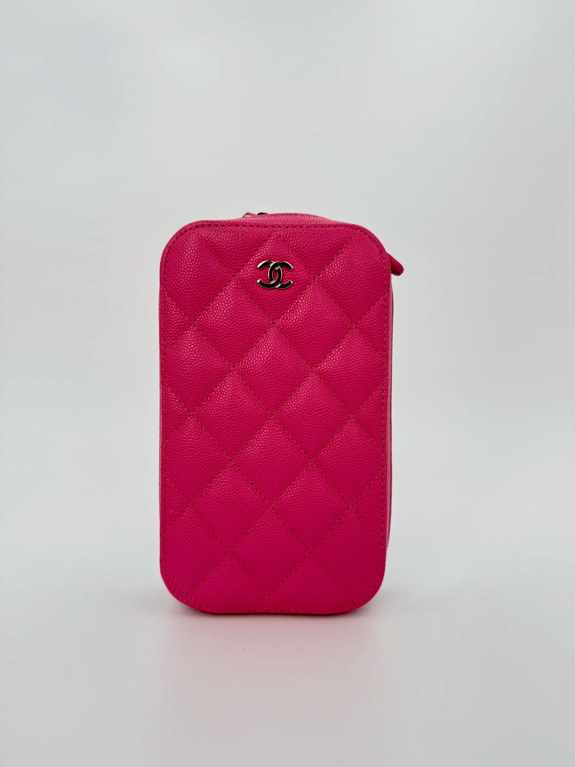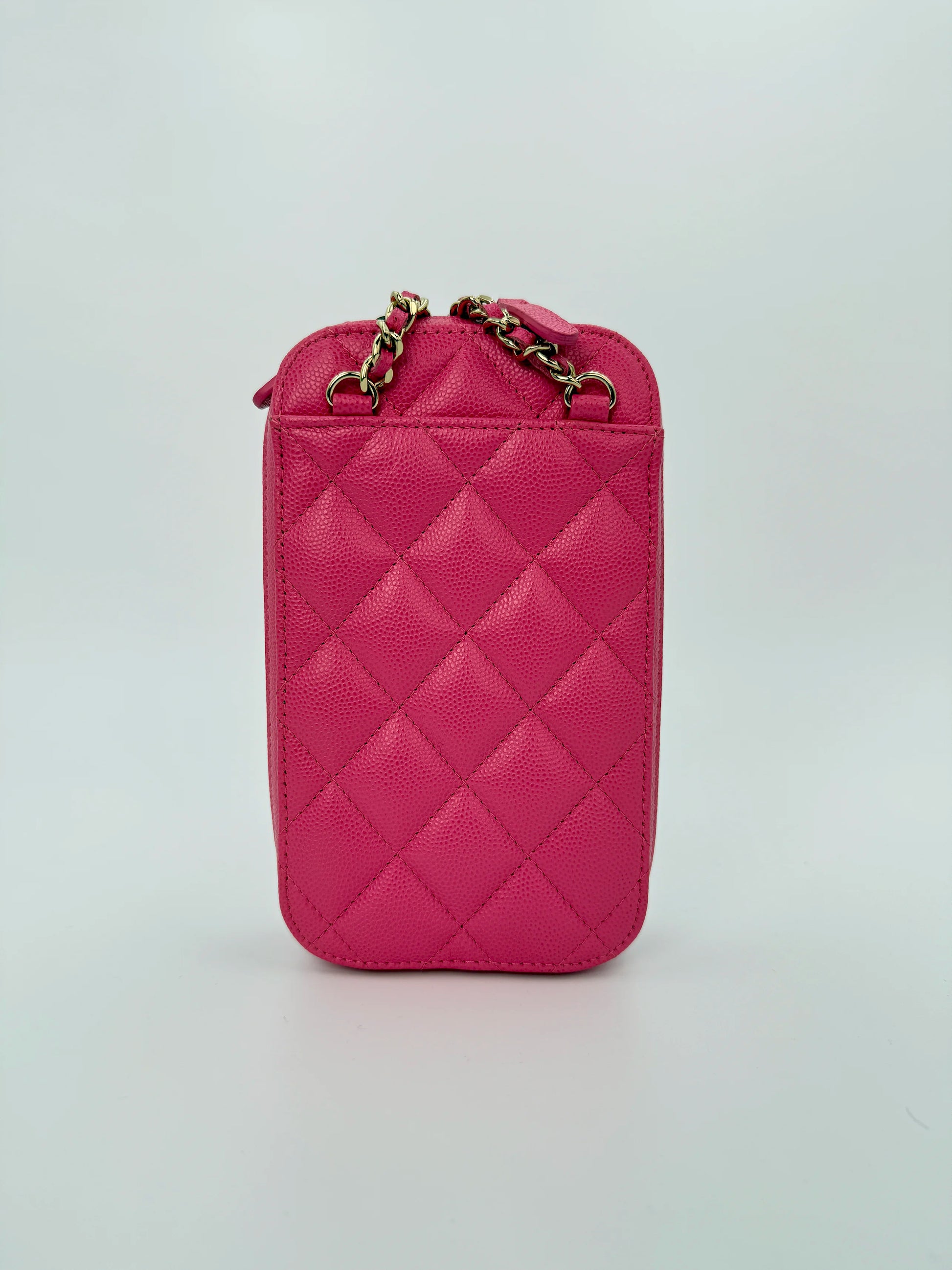 This Chanel Pink Caviar Phone Pouch is a stylish yet practical piece designed for modern lifestyles. Crafted from durable caviar leather with champagne gold hardware, it features a compact silhouette perfect for carrying your phone and daily essentials. A versatile crossbody design makes it a must-have for both everyday wear and special occasions.