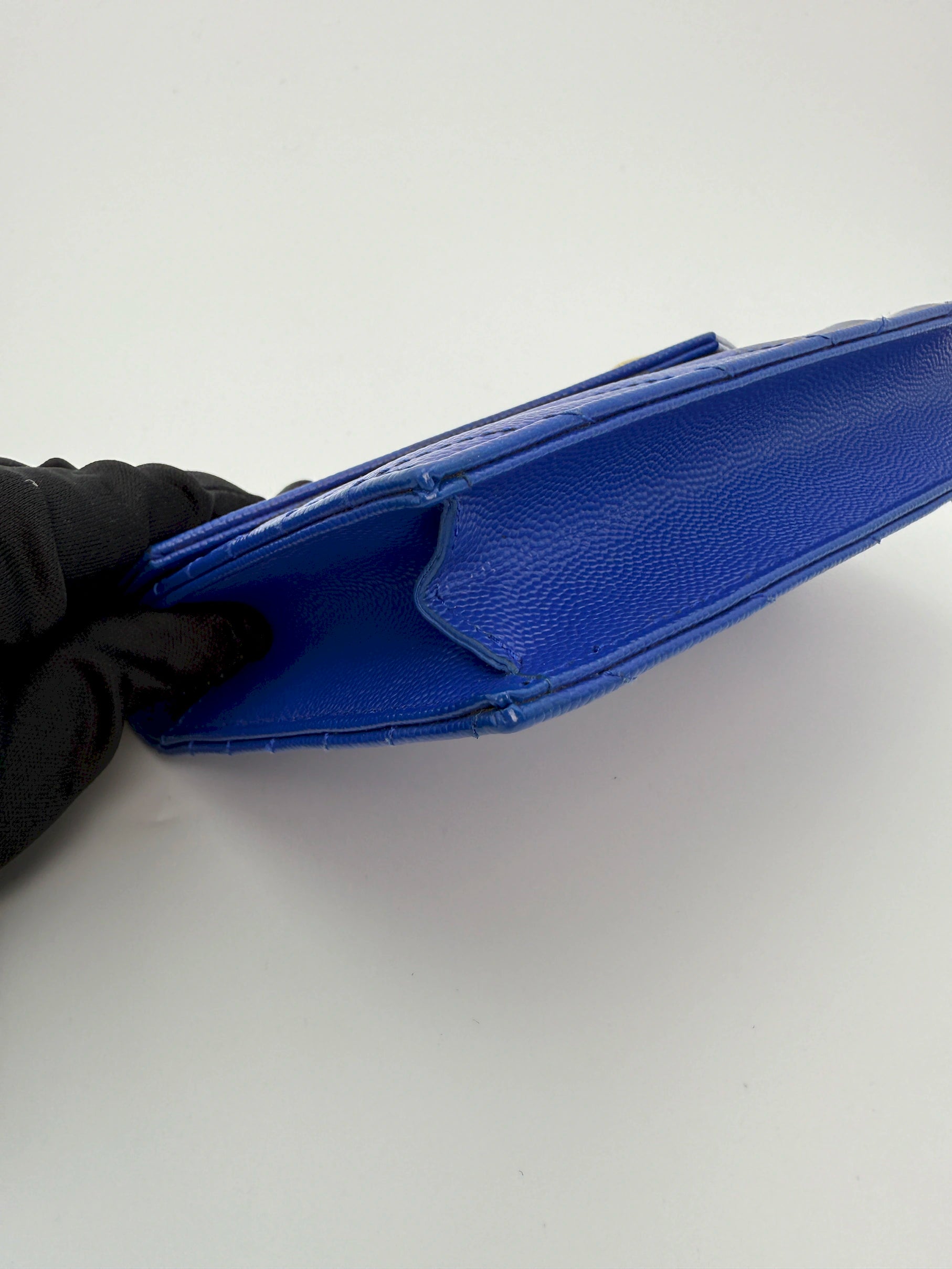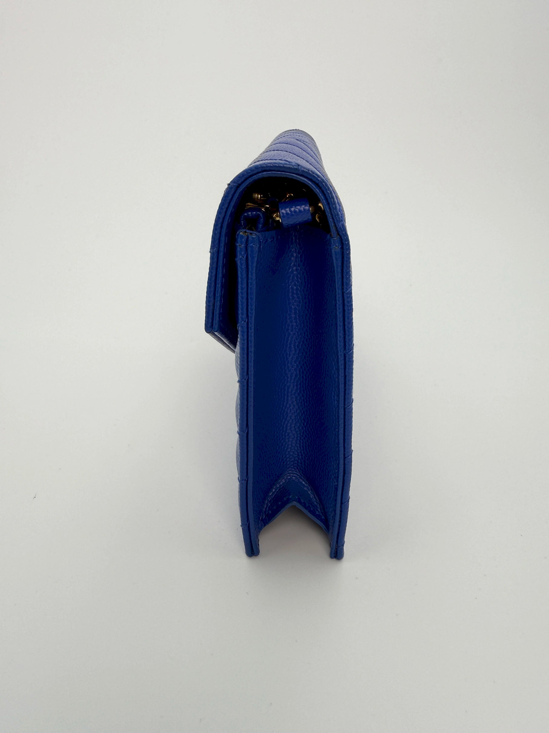 This Saint Laurent Cassandre Wallet on Chain is crafted from durable blue caviar leather, featuring the iconic YSL logo with polished gold hardware. Its slim yet versatile design makes it perfect for both day and evening wear. With a removable chain strap, it can be styled as a clutch, shoulder bag, or crossbody, offering timeless elegance and functionality.