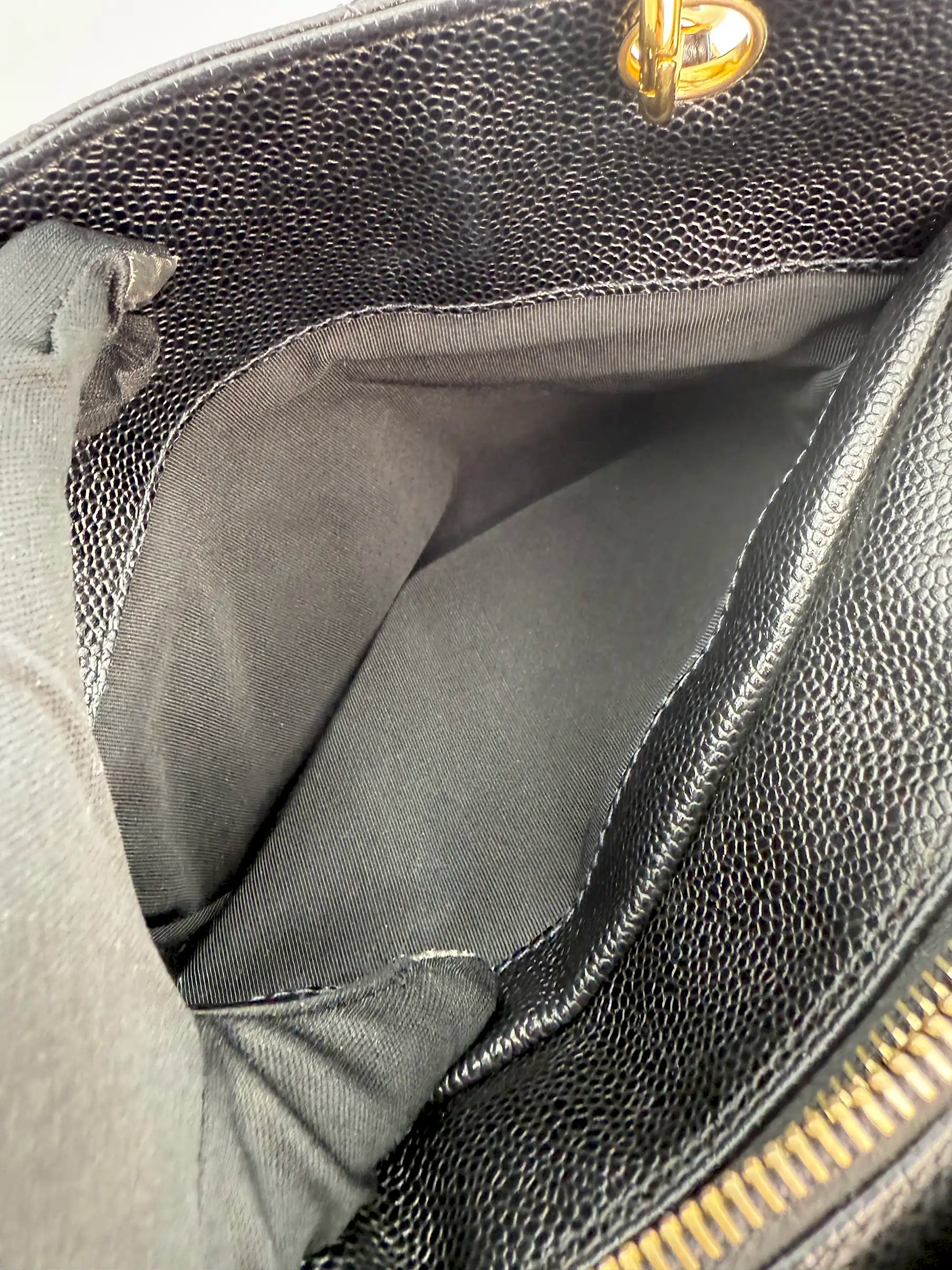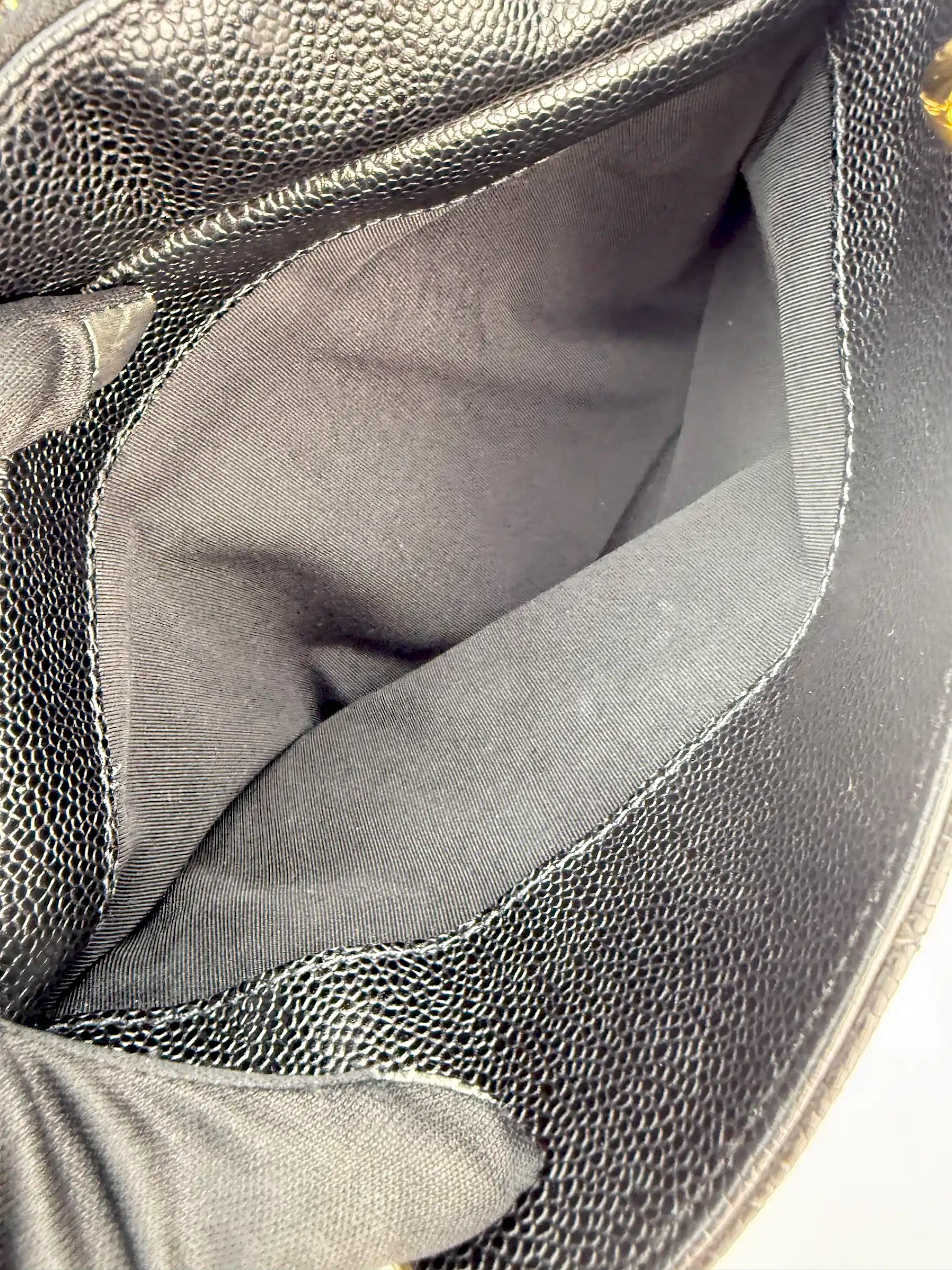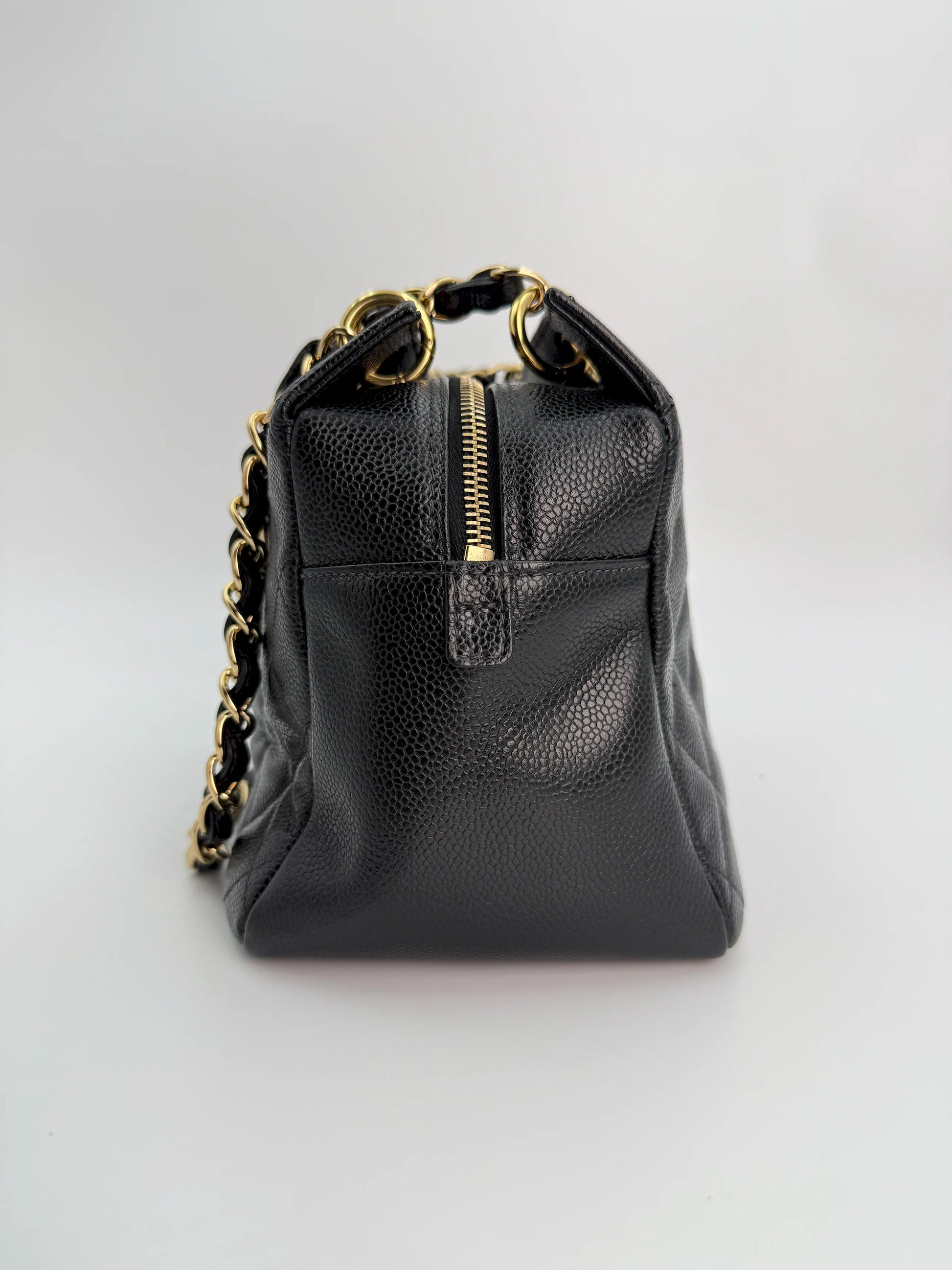 This Chanel PTT Tote Bag is crafted from durable black caviar leather, accented with timeless gold hardware. A classic piece from Chanel’s Series 7 (2003–2004), it features a structured silhouette and practical size, making it perfect for daily use while retaining elegance and sophistication.