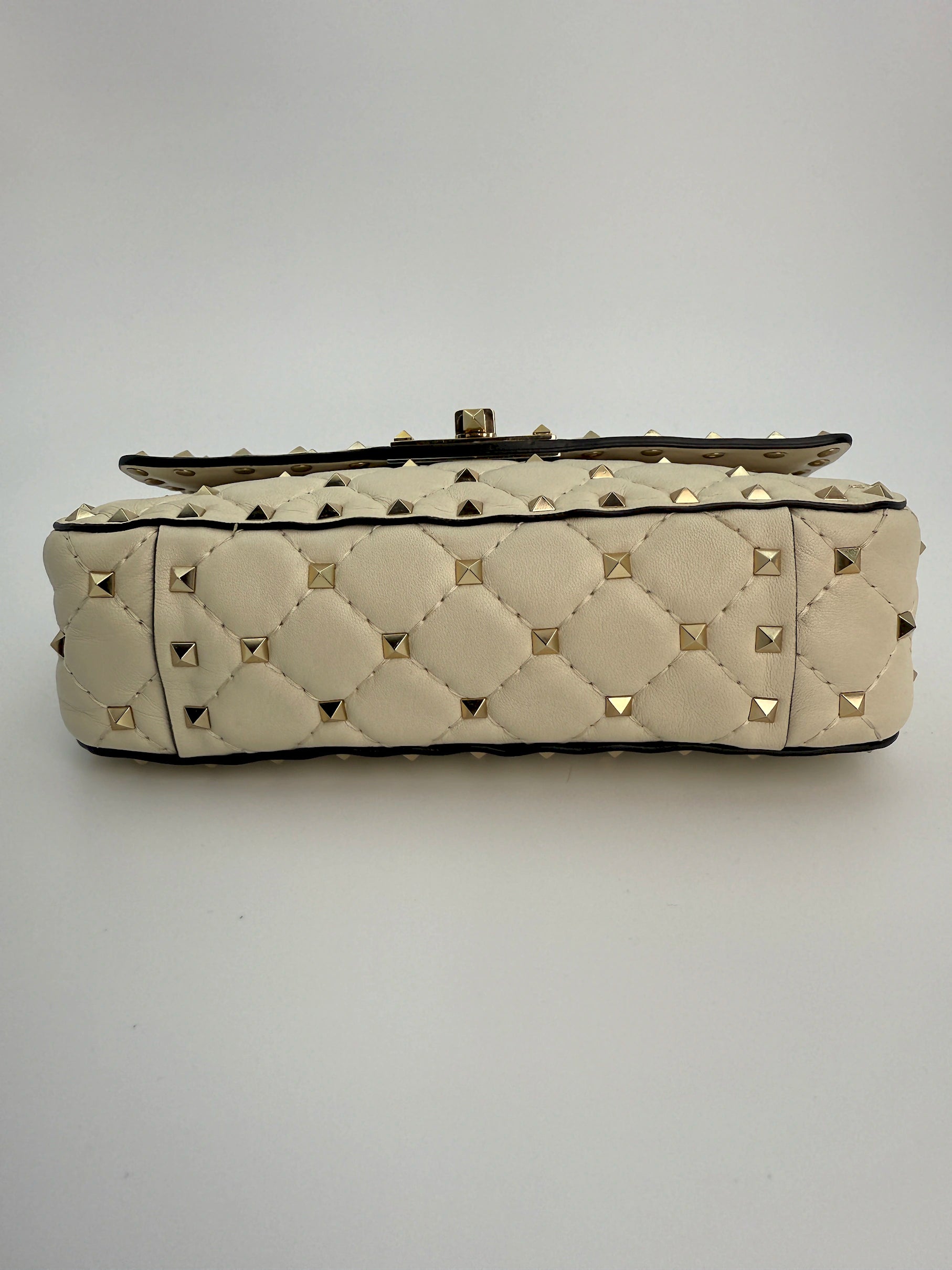 A sophisticated Valentino Spike shoulder bag crafted in elegant ivory calf leather with signature quilted details. The champagne gold hardware adds a refined touch, making it a versatile accessory for both day and evening wear.