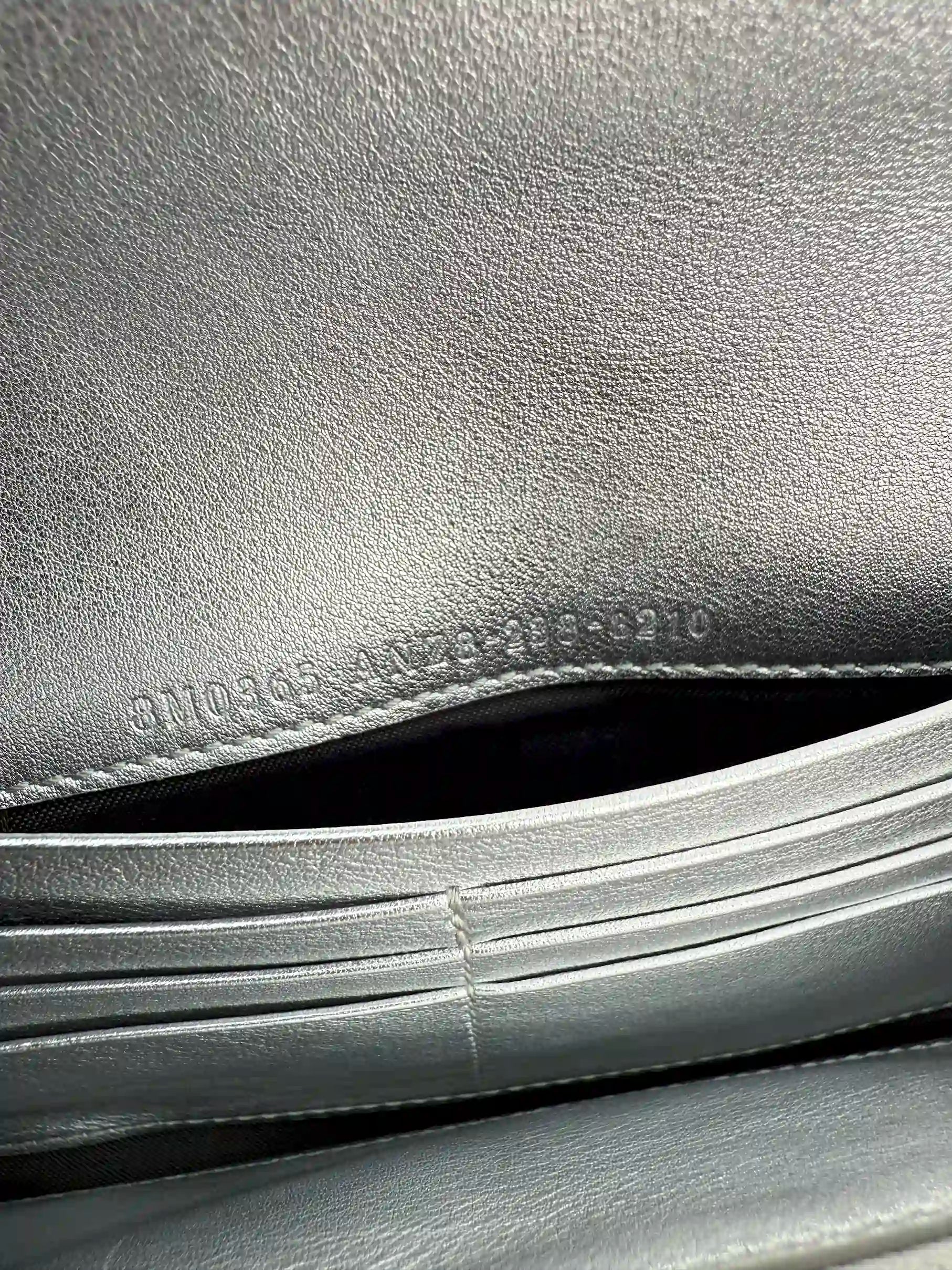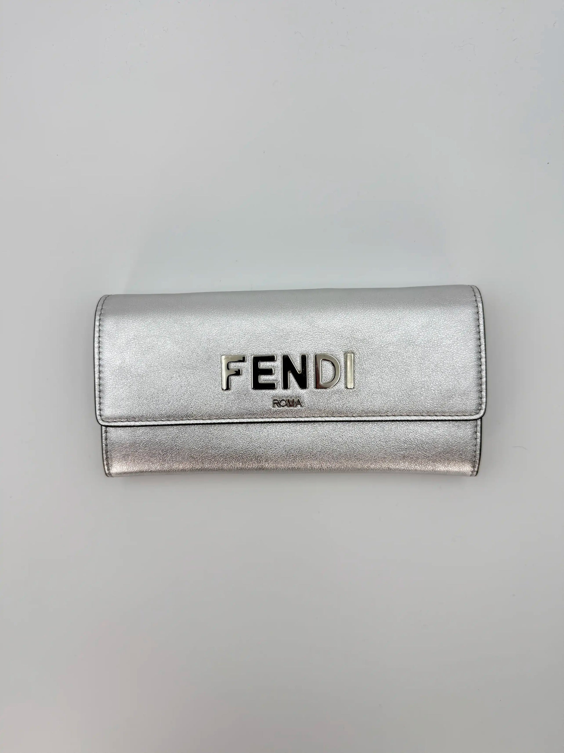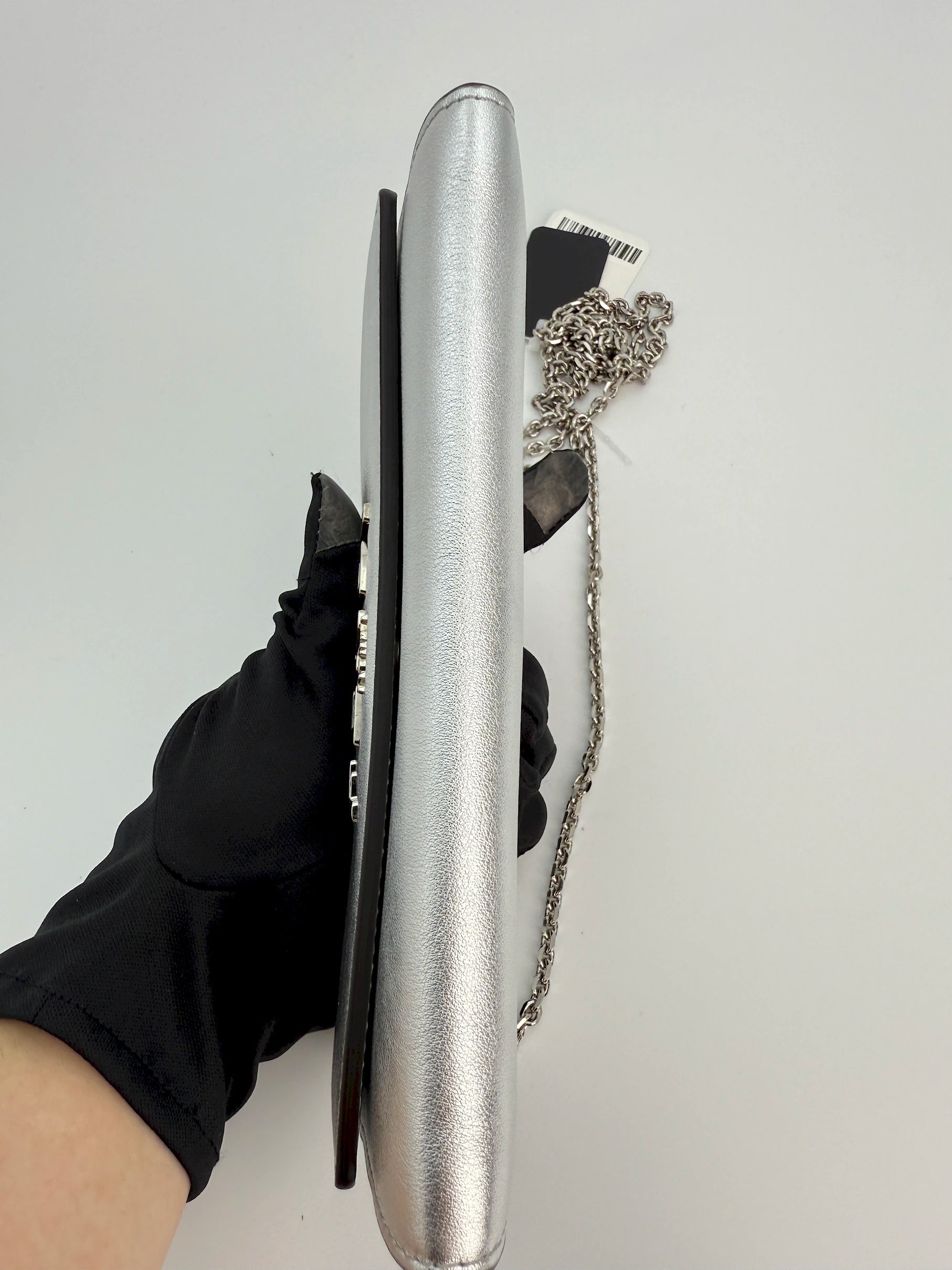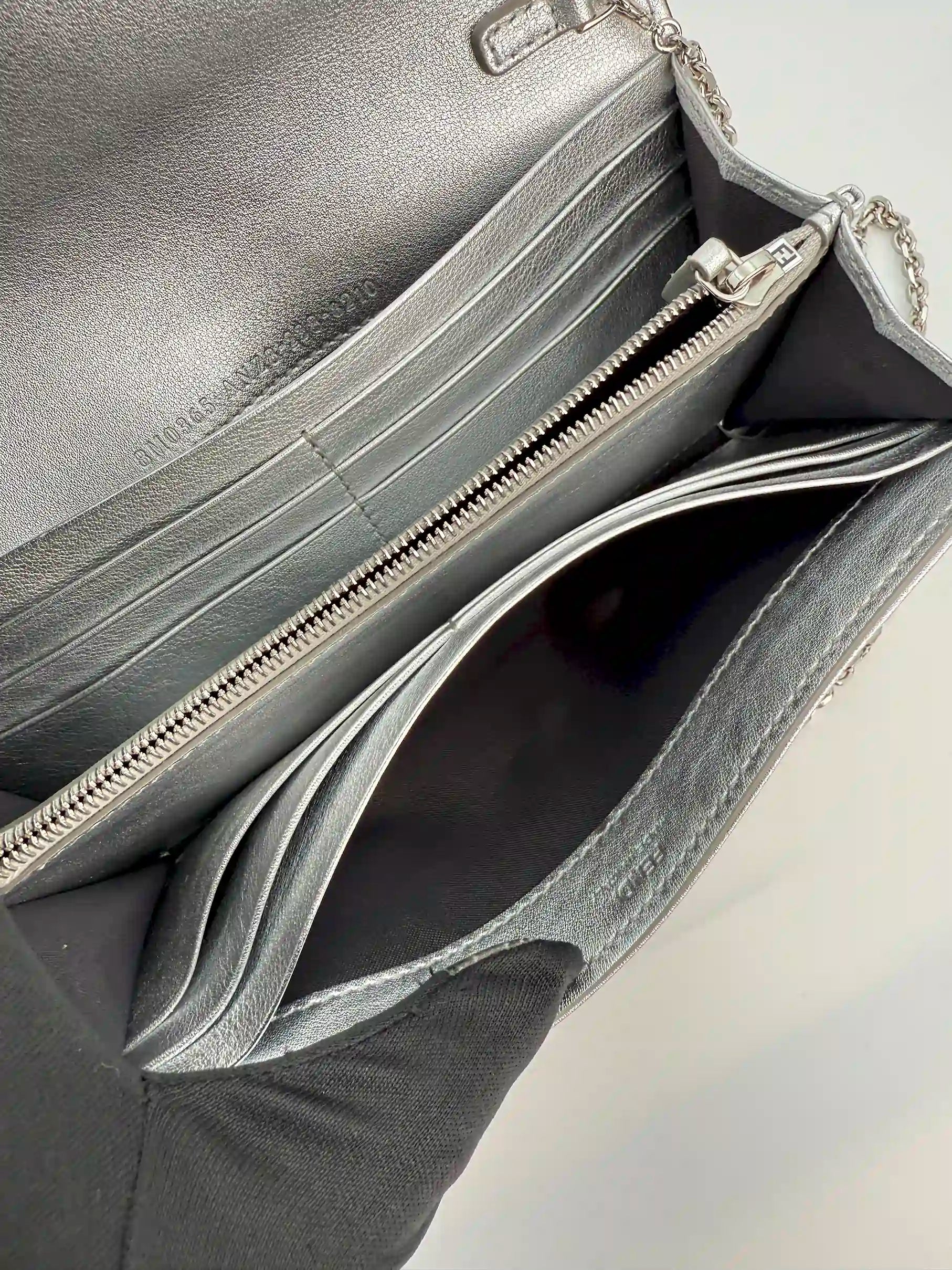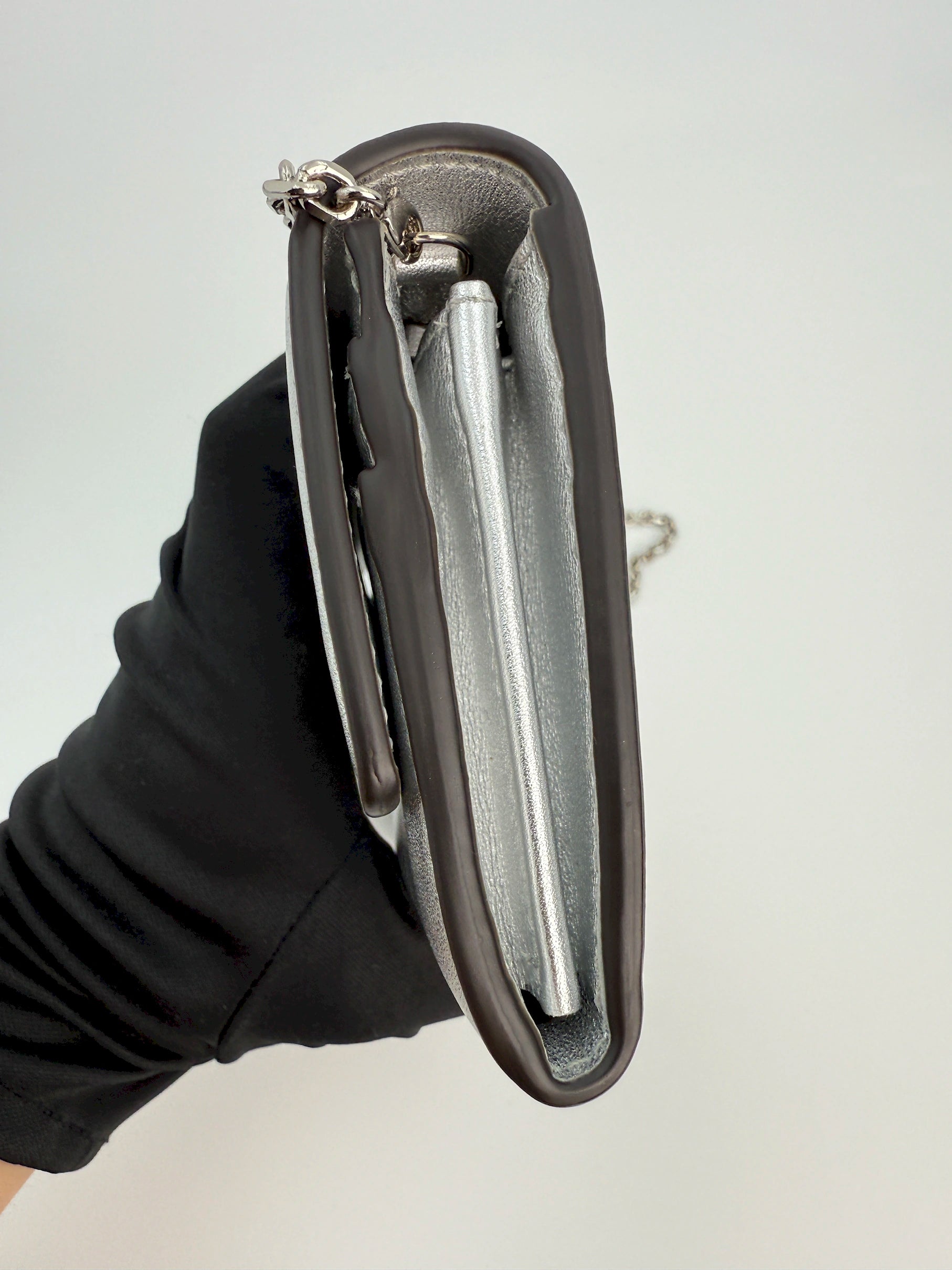 A chic and versatile Fendi wallet on chain crafted from metallic silver calf leather. Its sleek silhouette makes it perfect for both day and evening wear, offering functionality with timeless elegance.