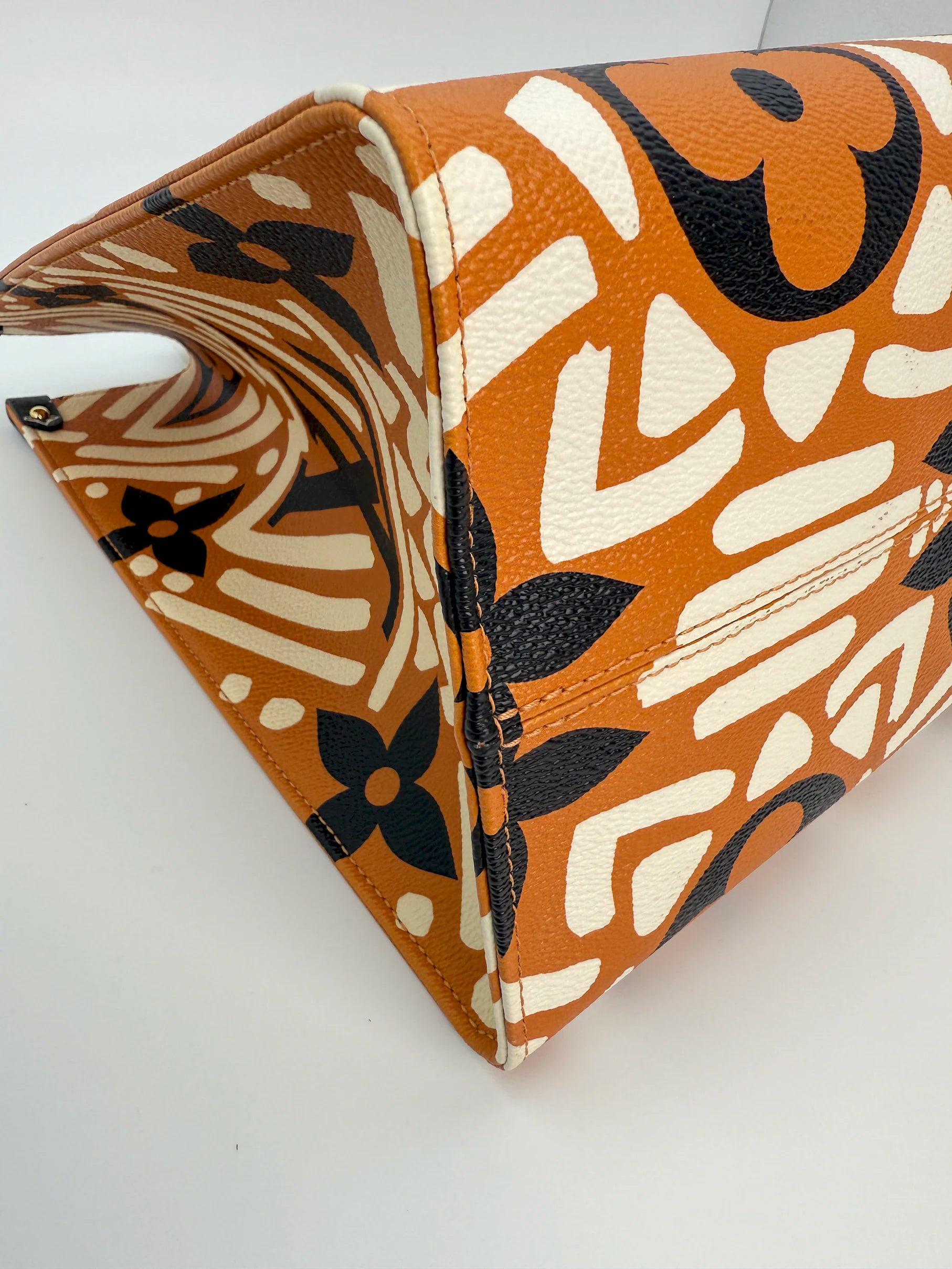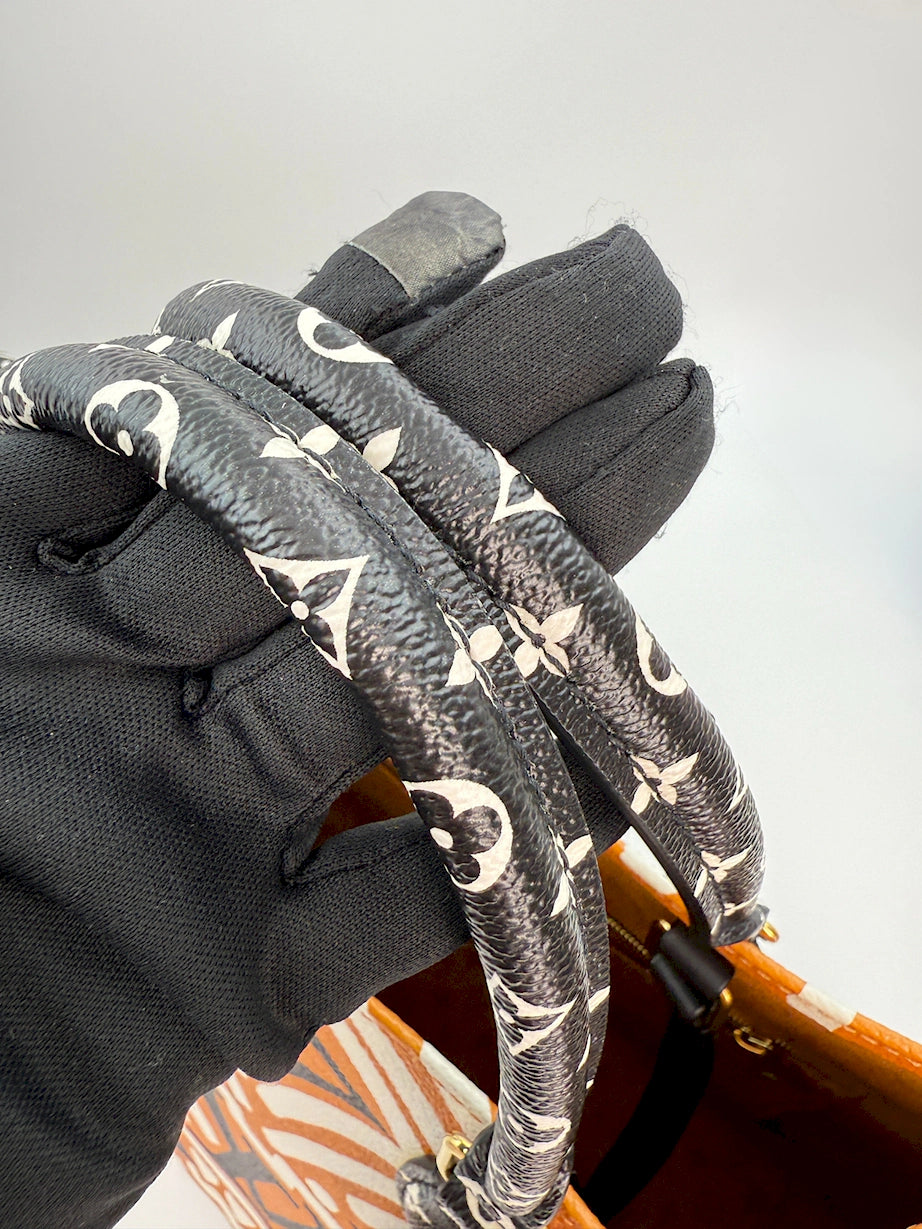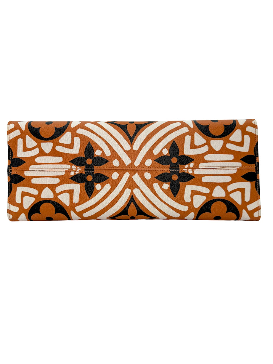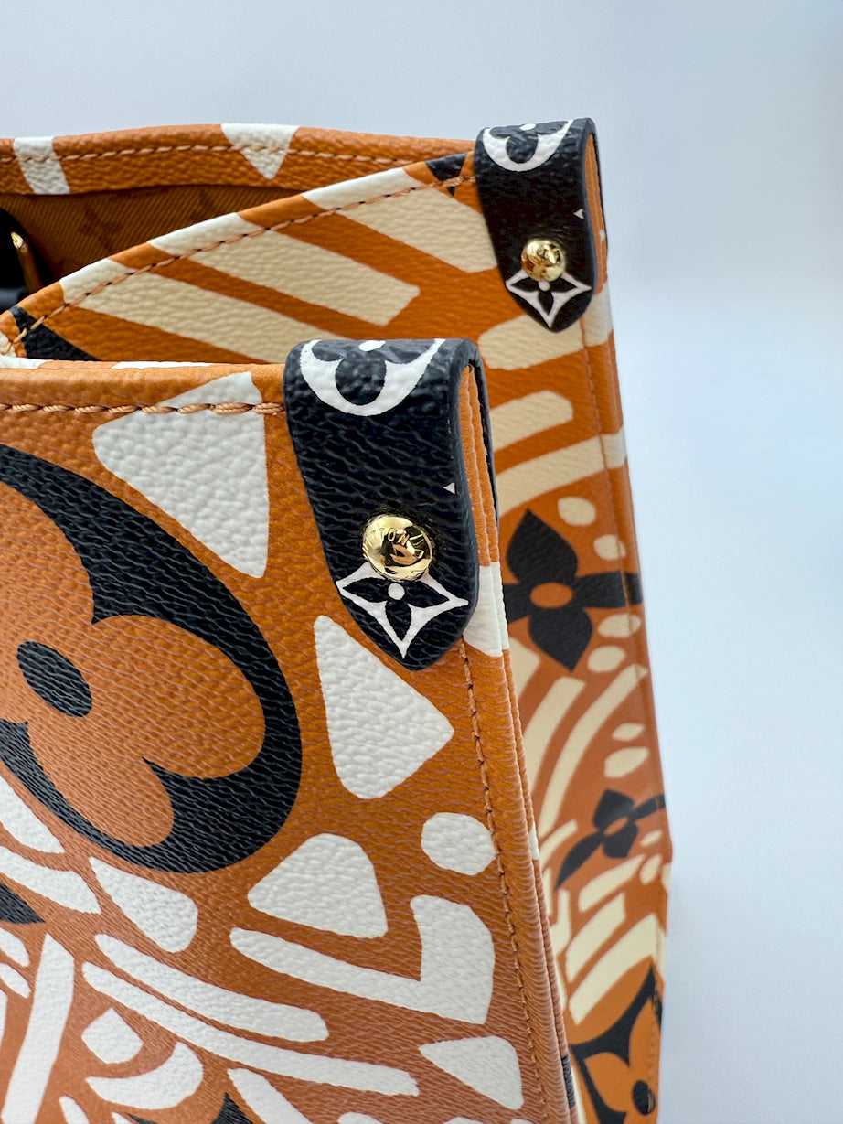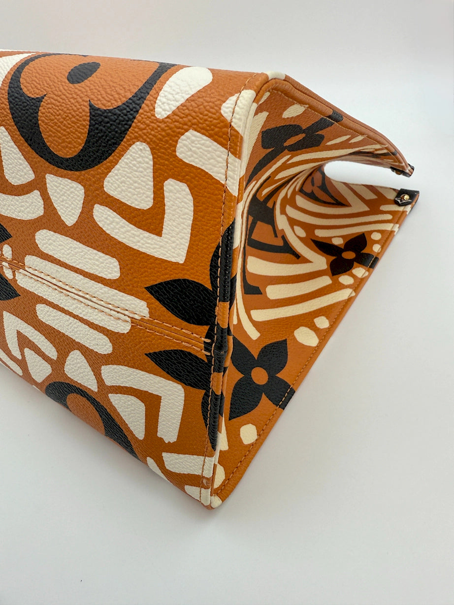 This Louis Vuitton Crafty Onthego GM bag is a bold and oversized tote crafted in Monogram canvas with the distinctive Crafty print. Finished with gold hardware, it offers both fashion and function. The roomy GM size makes it perfect for travel, work, or everyday carry, with dual top handles and long shoulder straps for versatile wear.