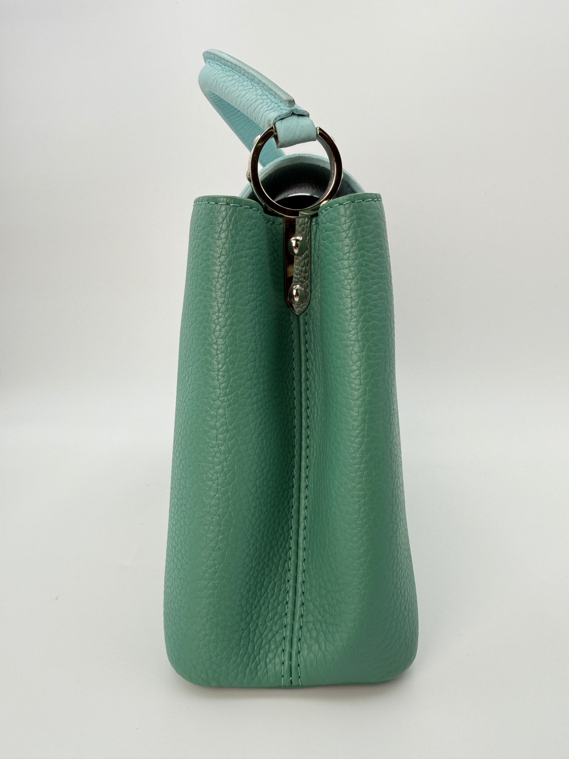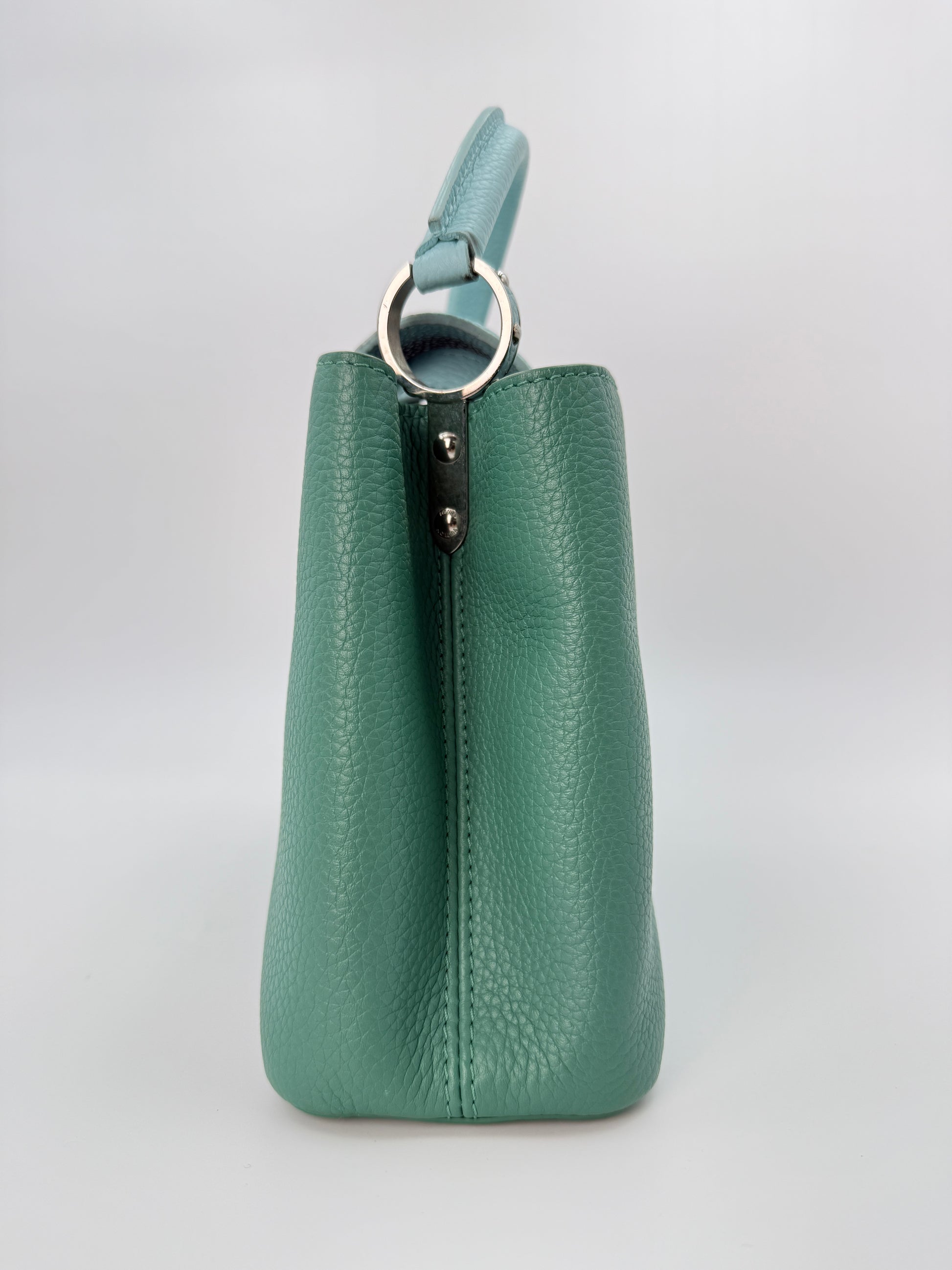This Louis Vuitton Capucines Medium bag is crafted from supple Taurillon calf leather in a unique green and blue tone, accented with refined silver hardware. Its structured silhouette and versatile design make it an elegant choice for both everyday wear and special occasions.